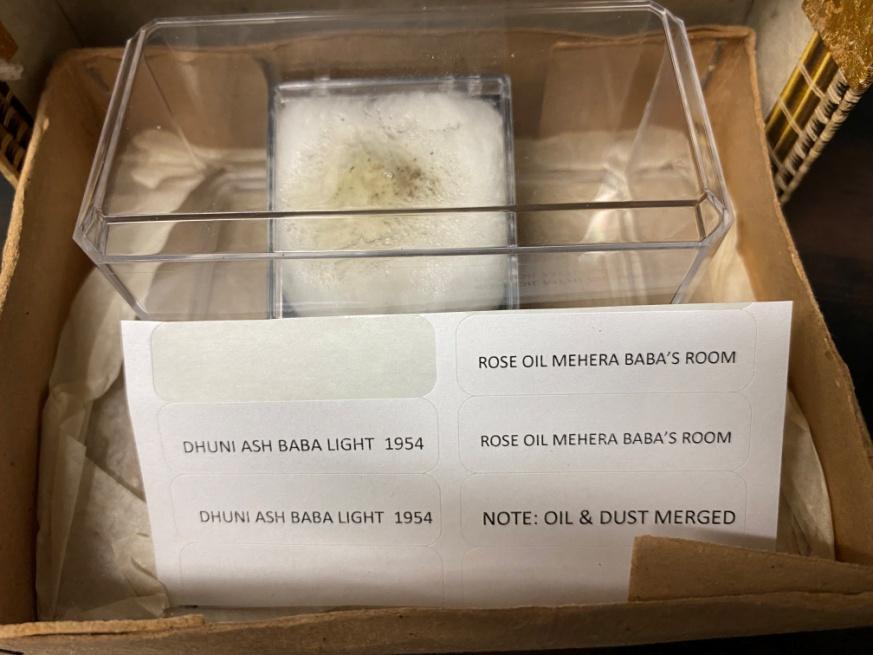 SN78 Dhuni ash 1925. A tiny silver box containing grey ash and labeled: Ashes first dhuni Meherabad 1925