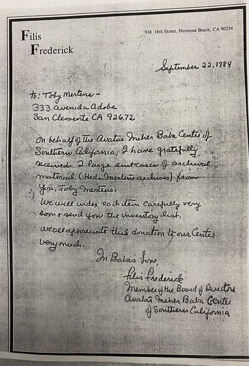 Clive Adams statement letter on Meher Baba’s Chair loaned to ABMCSC Chair originated from the estate of Hilda Fuchs