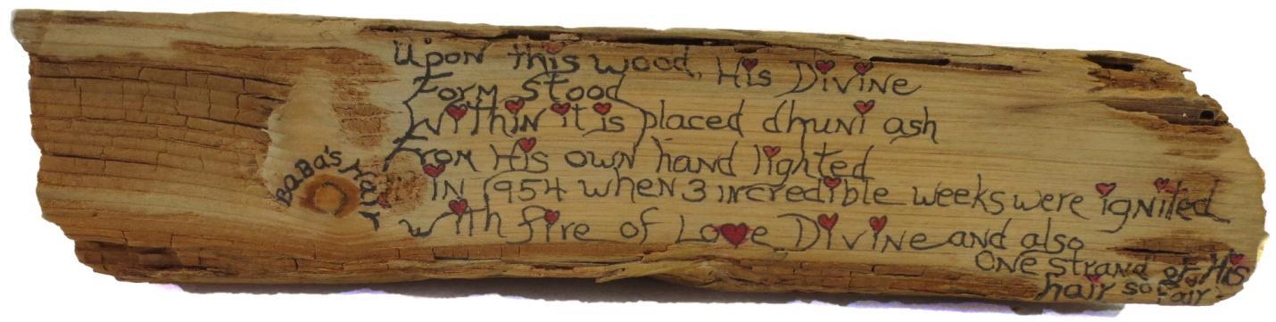 Upon this wood His Divine Form stood within it is placed Dhuni Ash from His own hand lighted in 1954 when 3 incredible weeks were ignited with fire of love divine and also one strand of his Hair so fair.