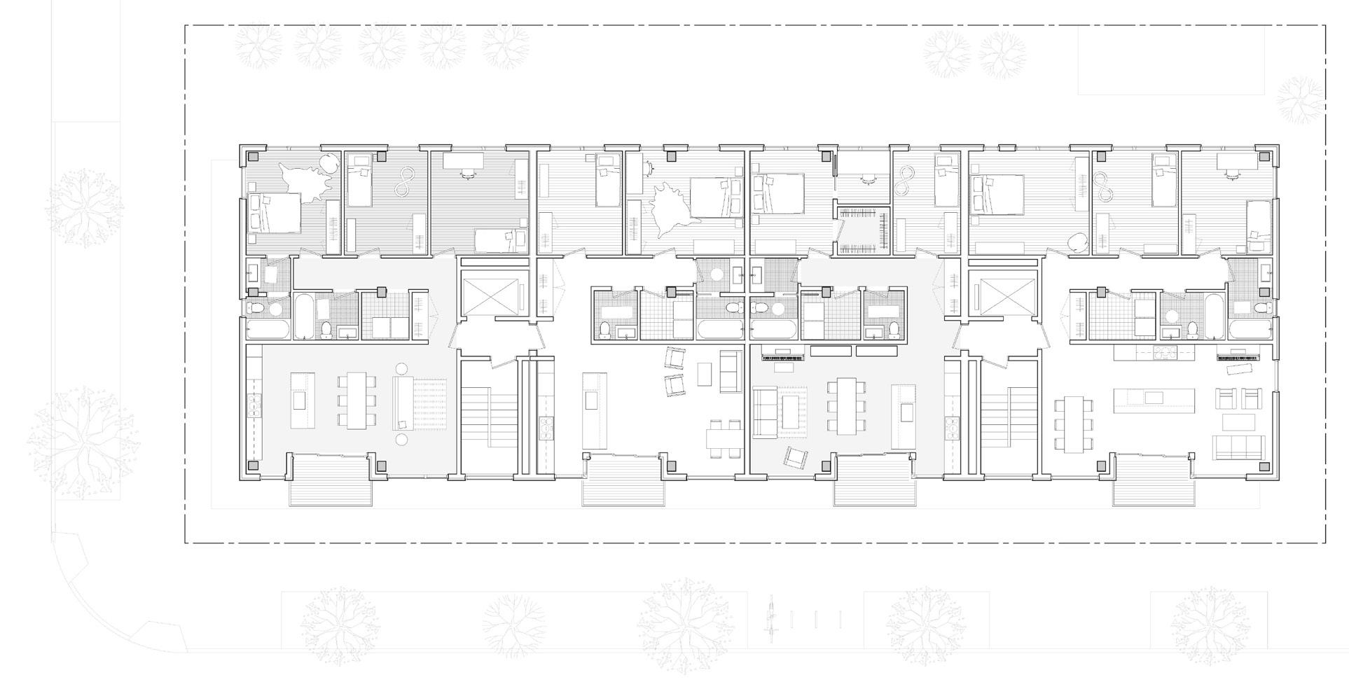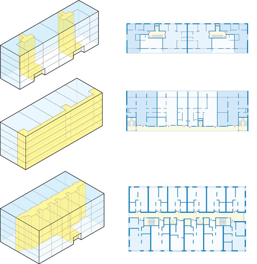 The workhorse for moderately dense urban housing is the single stair building, or as I call it the Point Access Block. These are found all over European cities, from small multifamily buildings on the outskirts, to dense perimeter blocks and high-rise towers. These buildings induce larger family-sized units and a more diverse unit mix, often in buildings with a far thinner building depth than we see in the US. This has the added benefit of allowing more courtyard or open space as well. Point Access Blocks allow for better daylight in homes, and often the ability to cross ventilate, as most units are dual or corner aspect.