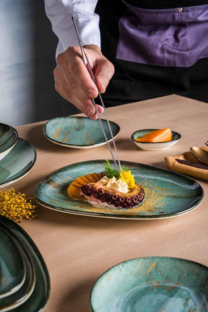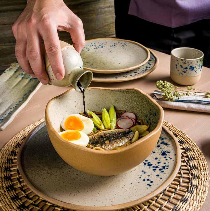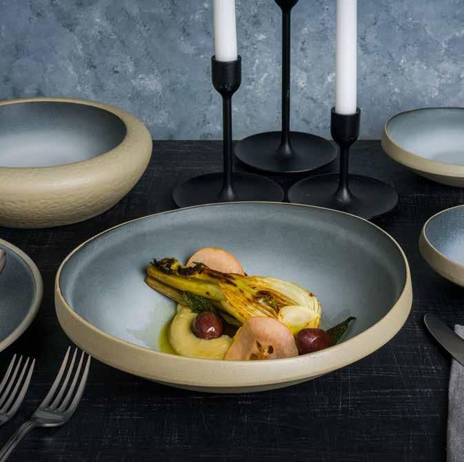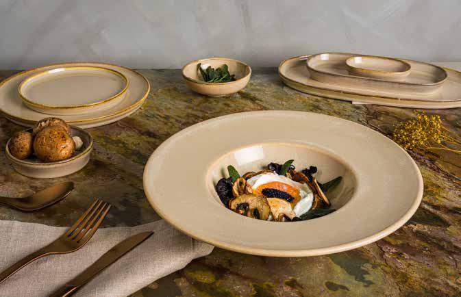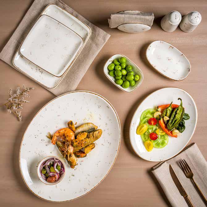 Enriched with cool tones, the Cras Collection adds sophistication to restaurants and cafes with its color palette inspired by gray and cream tones. Each piece in the collection reflects a unique and refined artistry, as if from a ceramic workshop, bringing a unique touch of nature to the dining experience. With pieces in different shapes and sizes, this collection is both eye-catching and versatile. Cras, which stands out as a sustainable collection, is produced from 87% waste porcelain, supporting the sustainability mission of restaurants and cafes.