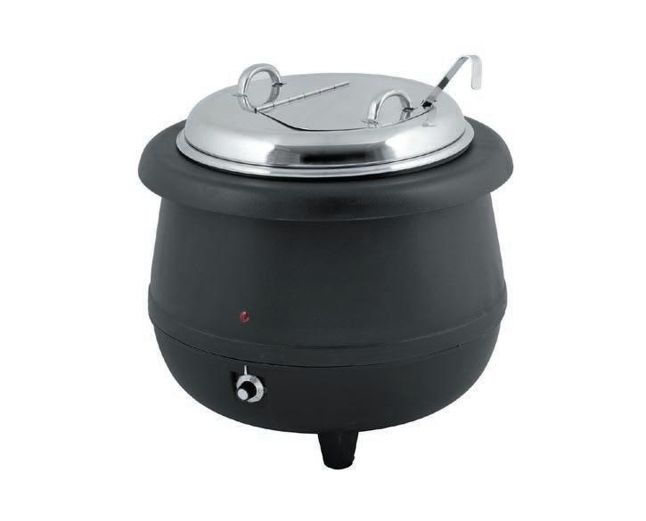 Polypropenbalja med inbyggda element. 1 st rostfritt täcklock med 2 hål. 2 st rostfria kittlar med lock samt 2 st slevar. Termostatvred samt on/off knapp.