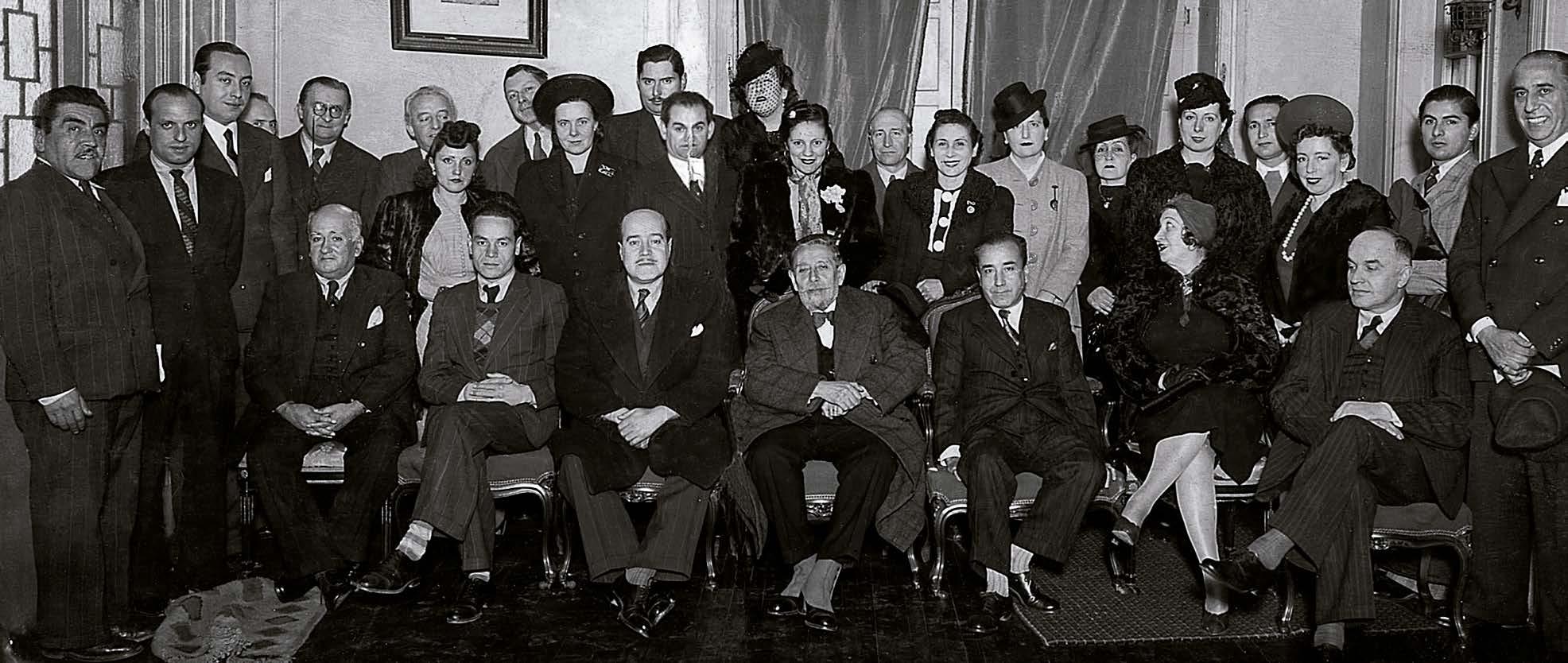 Ya inserto en el ambiente literario de la época, Nicanor Parra vuelve a encontrarse con Pablo Neruda, a quien había conocido en Chillán cuando el autor de las Residencias hacía campaña en favor de don Pedro Aguirre Cerda. Aquí, Parra es el séptimo de izquierda a derecha, de pie, y junto a él se ubican, entre otros, Álvaro Hinojosa, Alberto Romero, entonces presidente de la Sociedad de Escritores de Chile; Luis Enrique Délano y Rubén Azócar. En los asientos es posible distinguir a Ismael Edwards Matte, Pablo Neruda y Julio Barrenechea. Todos ellos participan en una recepción en la embajada de México, ubicada entonces en el lujoso palacio Falabella (que hoy acoge a la Municipalidad de Providencia), en la Avenida Pedro de Valdivia.
