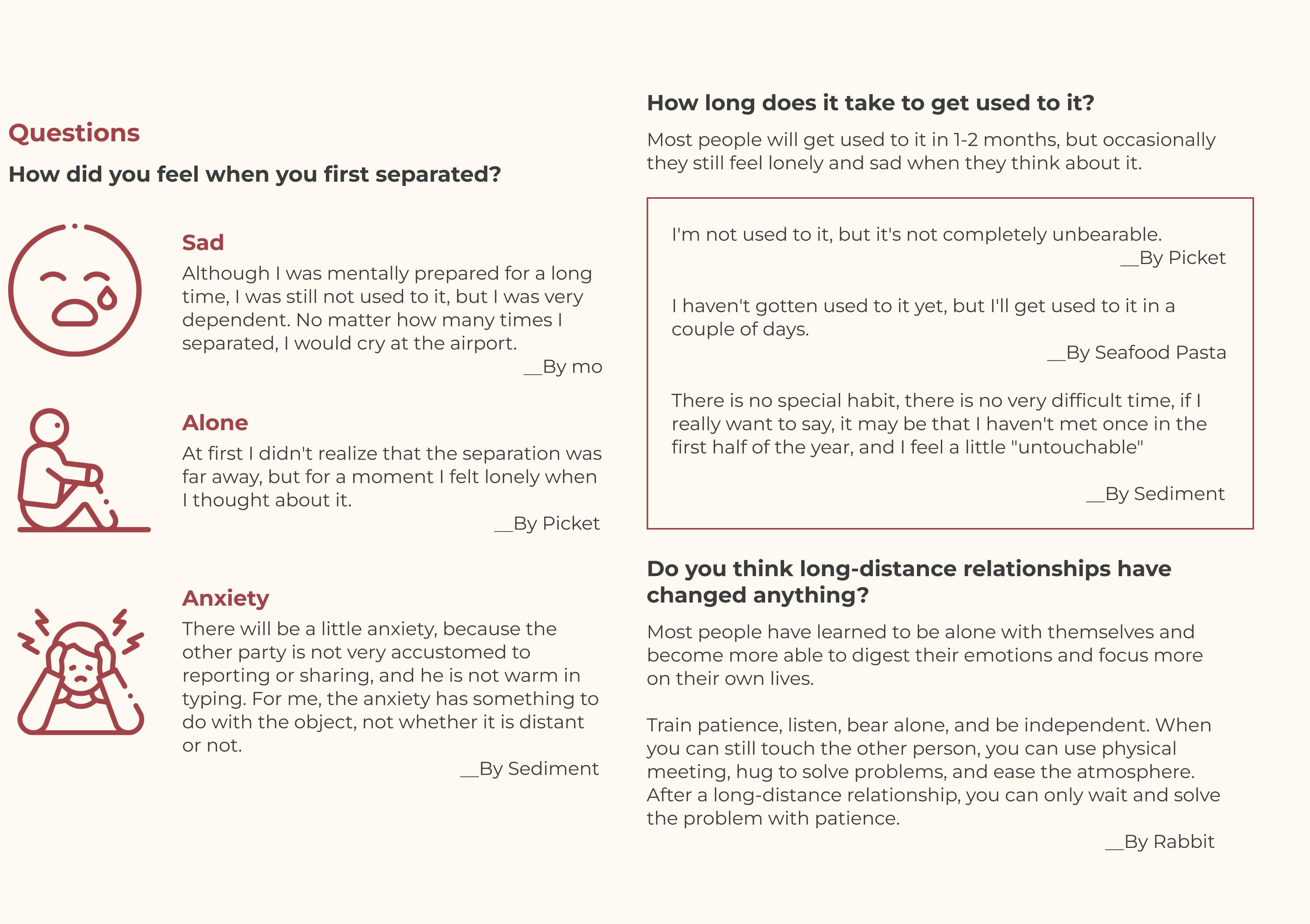 I am in a long-distance relationship with my boyfriend, who is studying abroad. I initially struggled with separation anxiety and worried about the relationship changing because of the distance. I researched long-distance relationships and found that many couples break up because of similar challenges. So as a designer, I wonder if there is a way for them to see the evidence of love, I believe they will become more trusting of each other.