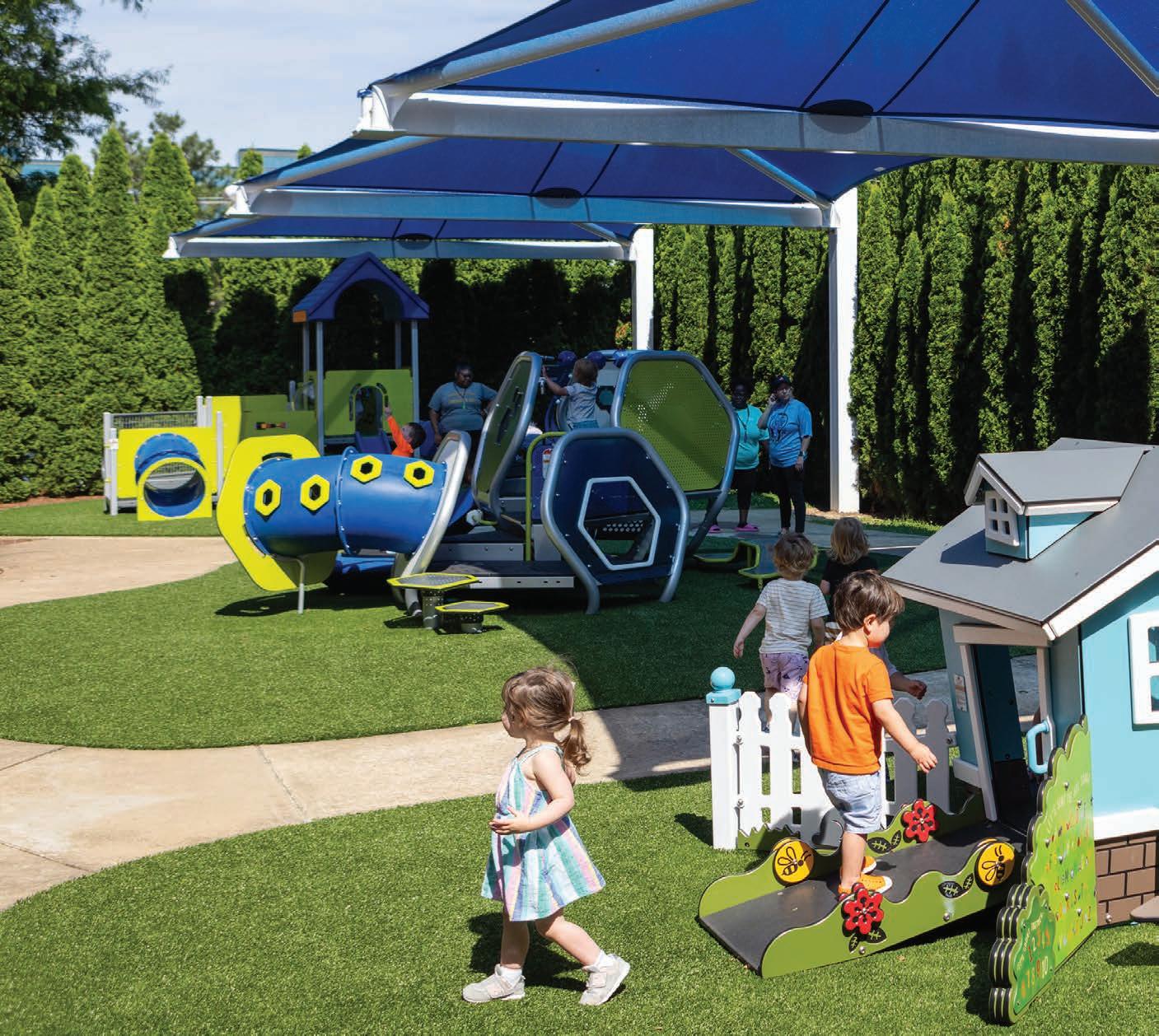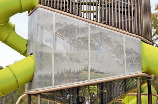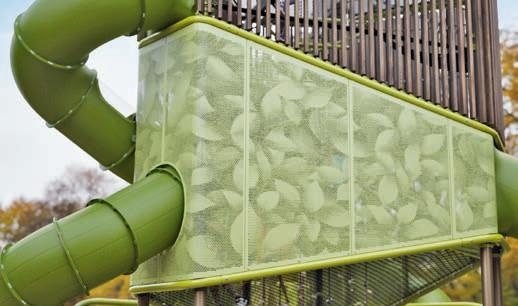 A nature-inspired theme helps underscore the many benefits of playing outdoors. Here, steel roofs featuring a laser-cut leaf pattern create a woodland-like tree canopy and add further dimension with sensory light play.