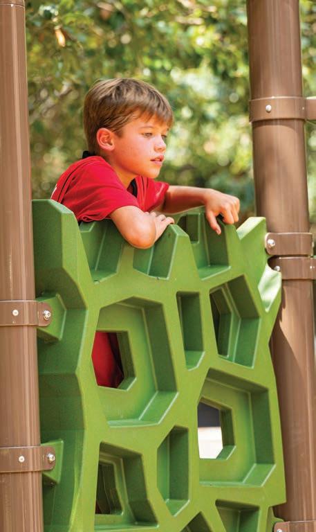 E lementary students may participate in games with rules, often of their own making. When creating your school’s playground, be sure to provide kids with plenty of physical challenges along with opportunities for imaginative, active free play. Consider positioning play equipment to form a circuit of continual activity, encouraging simple games of tag to more complex games of invention. Here a traditional PlayBooster® PlayOdyssey® Tower meets an architectural Forma® climber, upping the climbing factor along with the WOW factor.