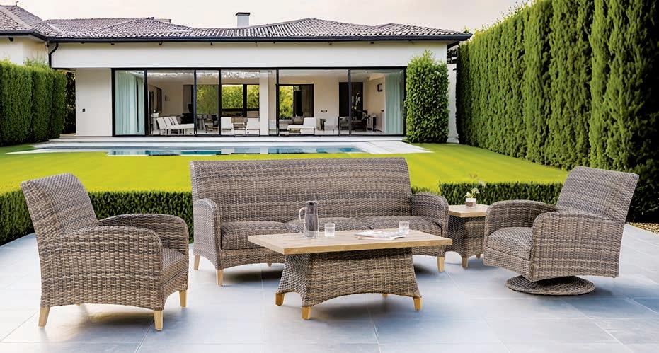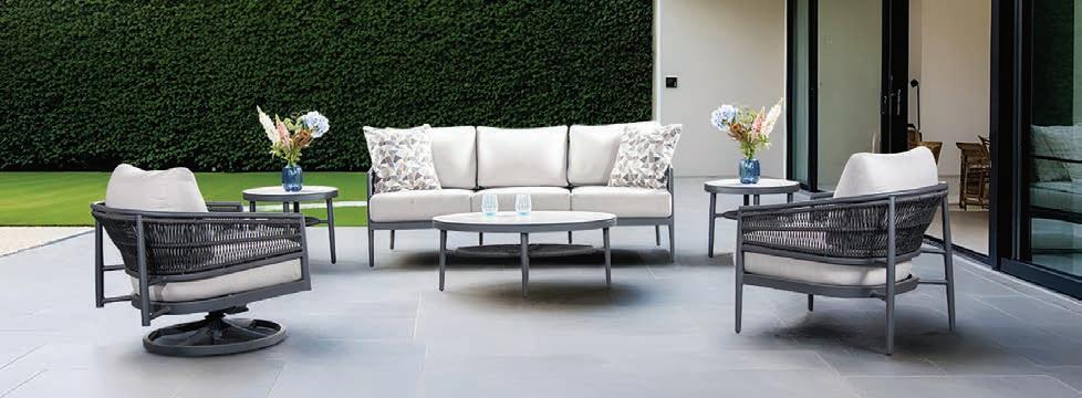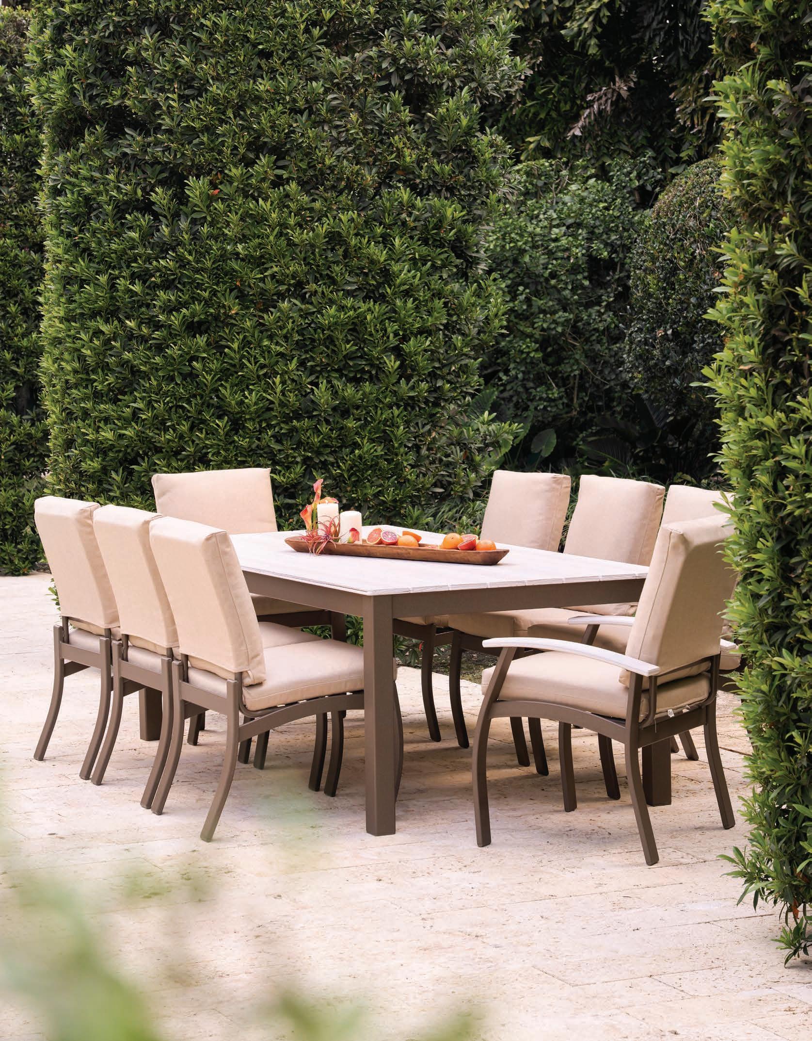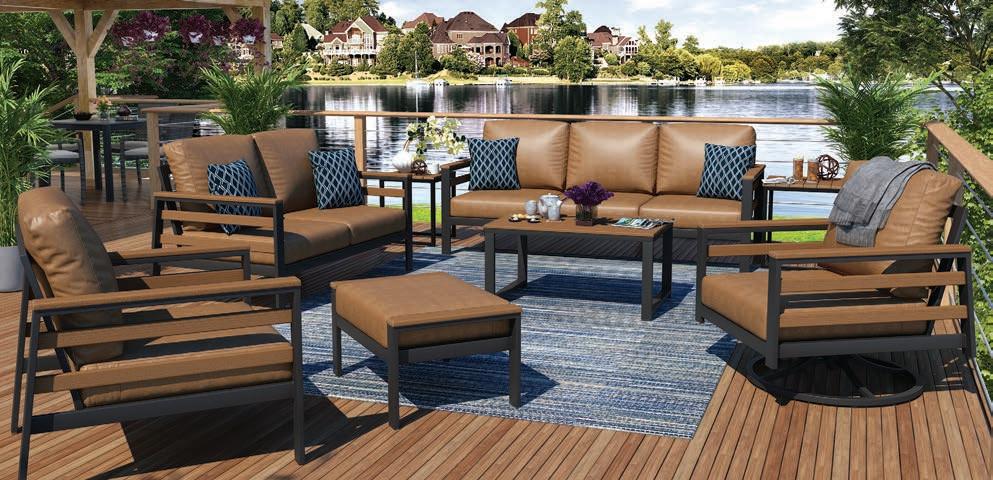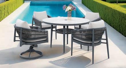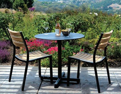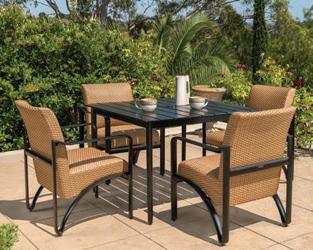 about 70% woven and 30% aluminum. Now it’s a reversal,” he says. “We’ve seen a slowdown in the demand for woven products, especially dining, so we’ve adjusted our factory capacity to produce more aluminum products. Our product introductions over the last 2-3 years have been leaning toward aluminum and we’re using woven as an accent. Mixed media, in fact, enables designers to get more creative.” The company also plans to start introducing more tabletop options that mimic the look of natural stone and “are basically bulletproof—very durable, no cracking or fading.”
