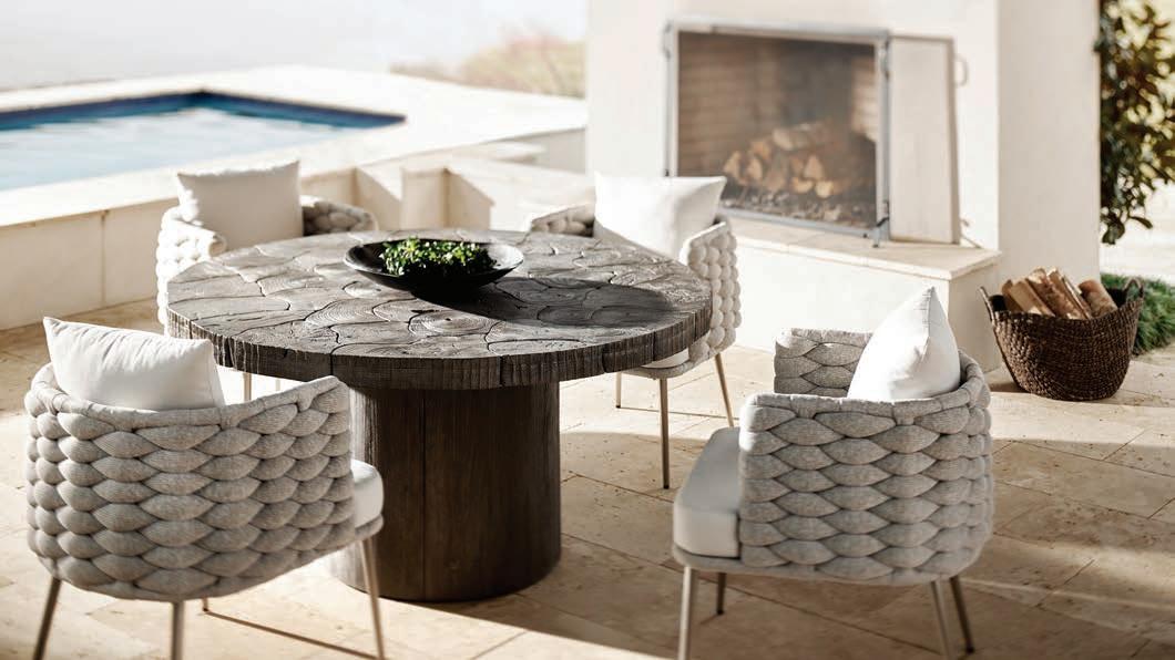 From the dramatic dining table offerings noted by Pilgrim, the Madura infuses outdoor spaces with “a fresh energy of organic elements.” Crafted from carbonized sliced teak, the round top of this contemporary table fea-