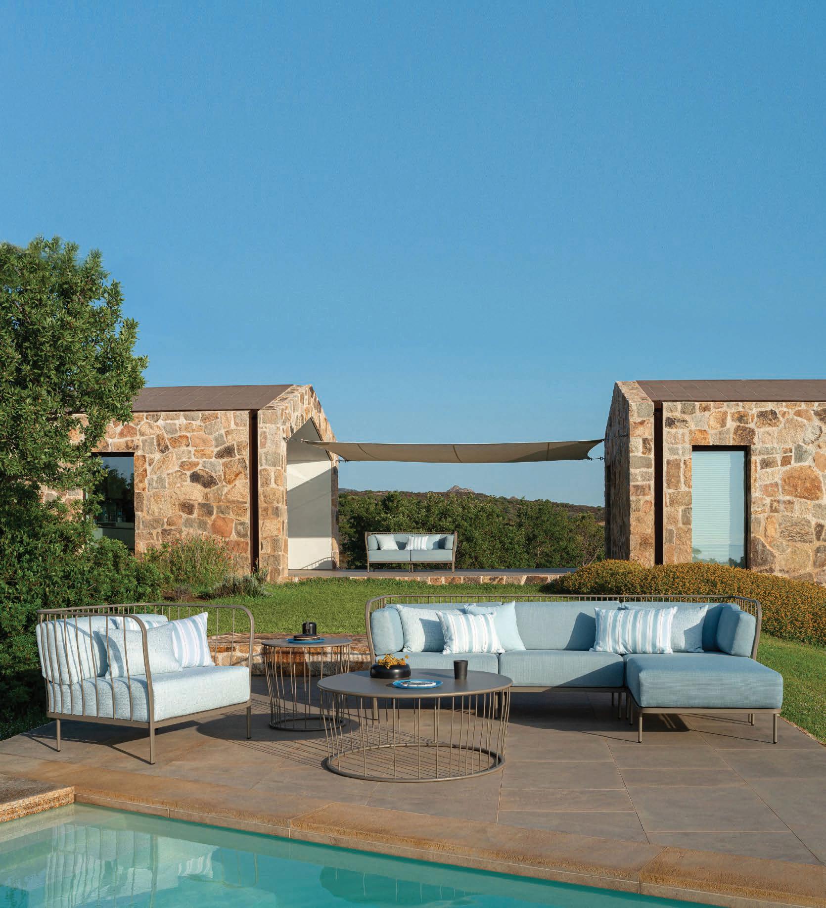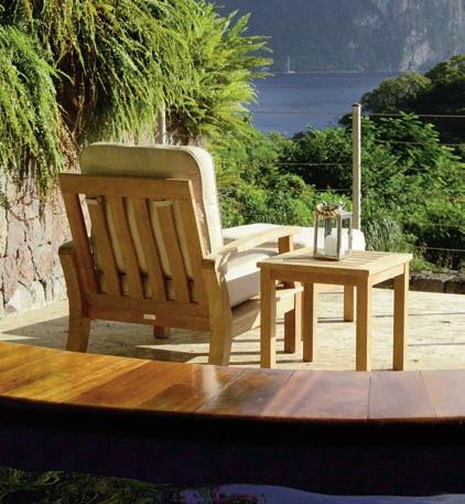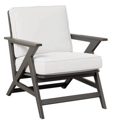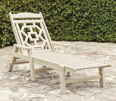 Simple, sturdy, and sleek, Sierra’s large scale and wide stance is designed to be eye-catching and exceptionally roomy. This deep seating and occasional table collection uses NexTeak wood alternative material and can be upholstered in numerous Woodard fabric options. The new NexTeak is the next evolution of alter native teak. Combining upcycled waste with modern technology, NexTeak is an eco-conscious material that withstands the demands of outdoor living. Weather resistant and care free, this unique product gives you the warm look and feel of teak without the maintenance or upkeep. Contact: www.woodard-furniture.com.