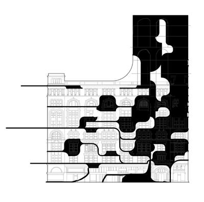 same time the art pieces and the artist are trying to go beyond the gallery’s threshold. This idea becomes the key concept throughout this project’s design. A byproduct of this push and pull is the gradation of permeability produced by both the perforated structure and the bulging of the panels; this process inuences the permeable design.