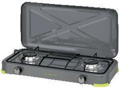 ideal für Camping- & Outdooraktivitäten 2 Aluminium-Druckguss-Brenner einzeln verwendbar, Ankochstellung und stufenlose Hitzeregulierung Deckel dient als Windschutz Kochgeschirrgrößen: bis ca. 30 cm Ø inkl. Druckminderer und 80-cm-Gasschlauch pro Stück