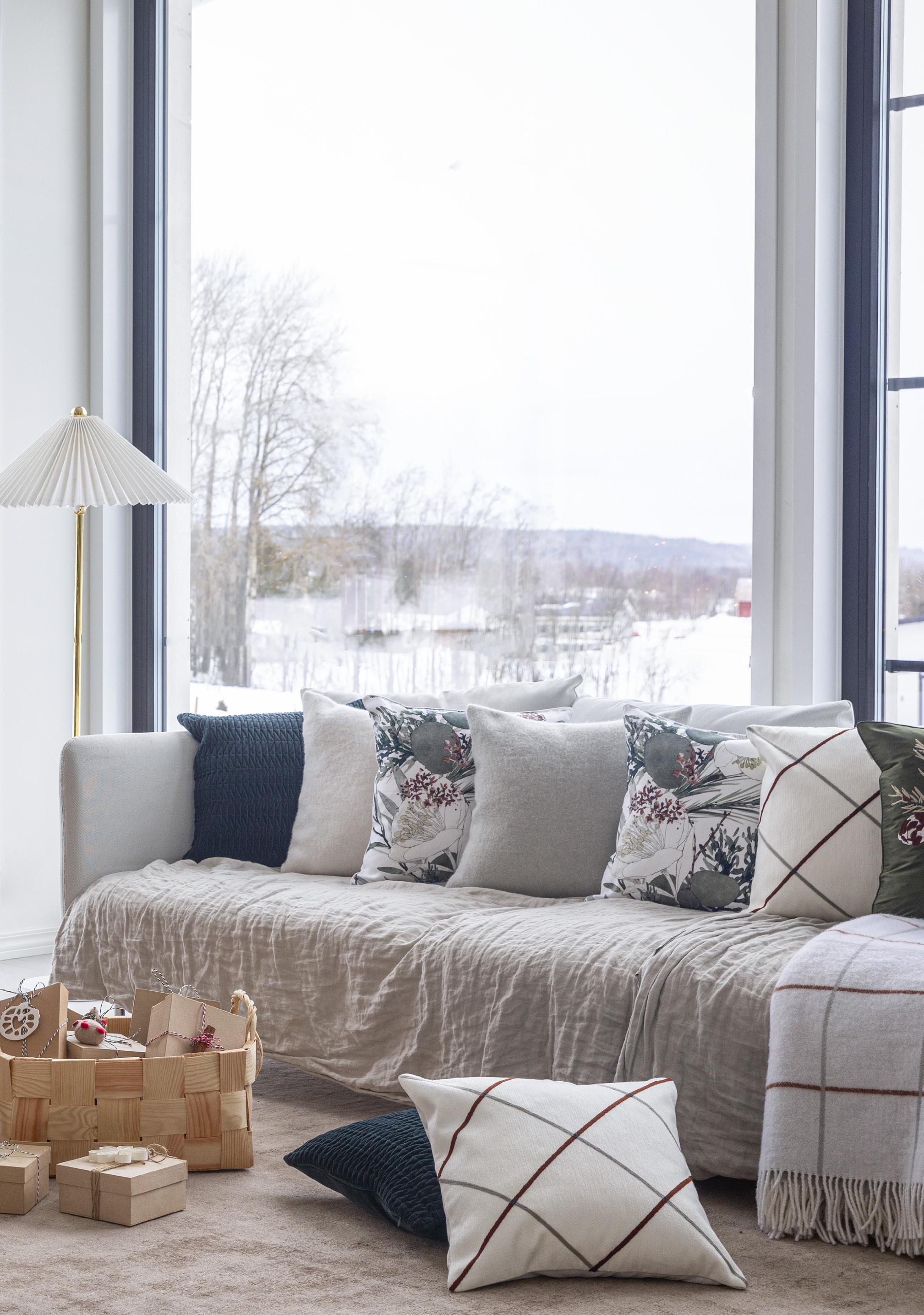 The first frost of winter is filled with anticipation of the holiday season to come, and so is our Lyhde (Sheaf) pattern designed by Lasse Kovanen. Lyhde feels like a lovely winter walk on a cold bright day. A light and neutral version of the traditional colors of Christmas, Lyhde features pale yellow oats, green-grey spruce needles and rosy little berries. You’ll find Lyhde on everything from tablecloths to cushion covers and cotton fabric you can use to make curtains, aprons or anything you can imagine. The light and airy Lyhde is the perfect pattern to kick off the holiday sea son.