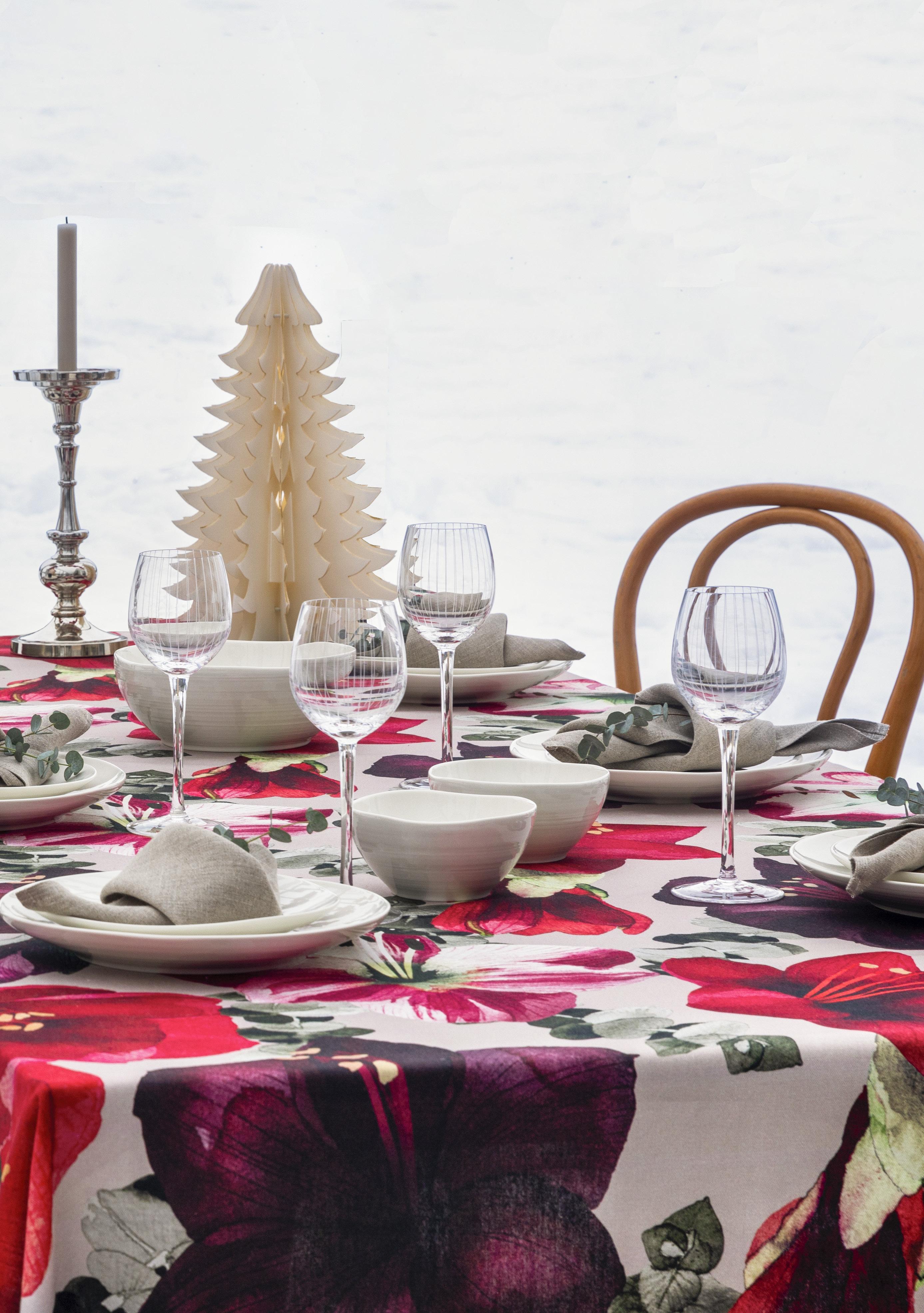 Amaryllis Tablecloth 145 x 250 cm, Kallio Plate 21 cm and 26 cm. Herttua Decanter 1,1 l and White Wine Glass 32 cl. Kallio Bowl 0,5 l, Serving Plate 32 cm and Serving Bowl 1,8 l Vesta Candle Holder 30 cm and Vekattu Dinner Candle 29 cm. Kuusi Paper Decoration 40 cm and Aro Blanket 130 x 170 cm.