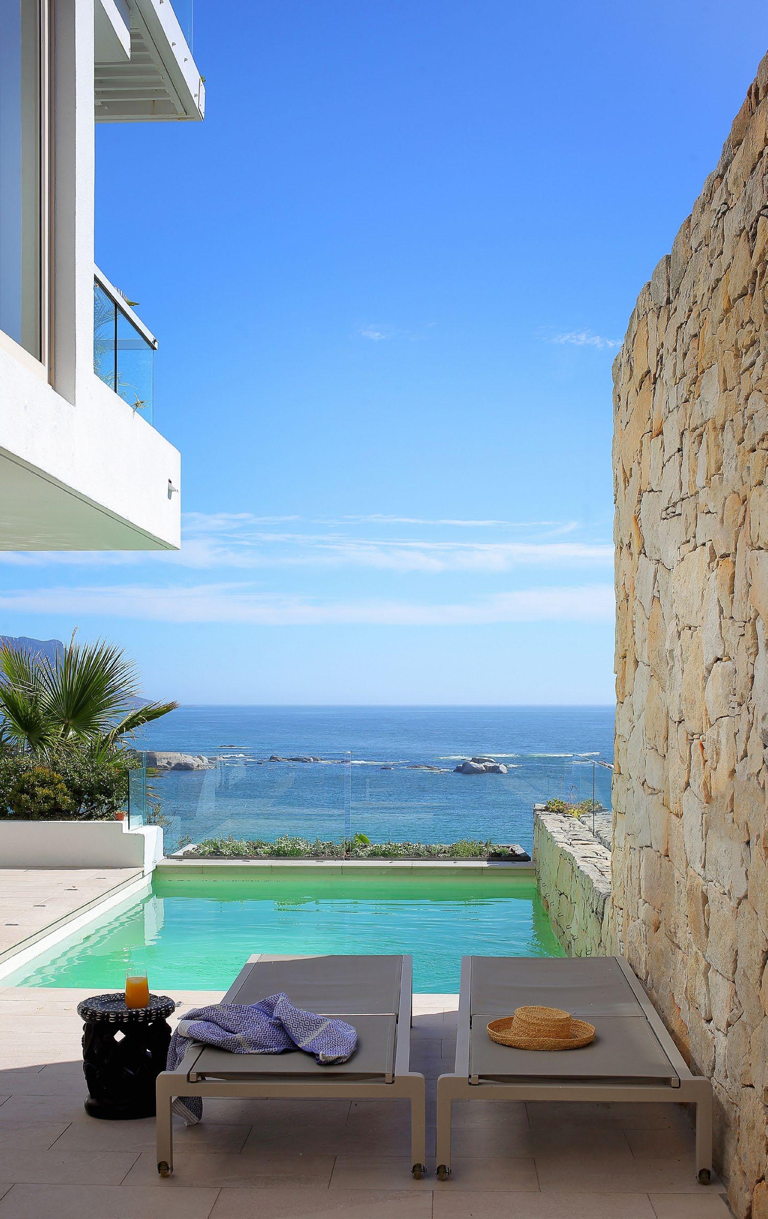We love the way the villa so beautifully bridges the steep slopes of the mountain on which it is anchored and the glittering Atlantic Ocean that stretches out as far as the eye can see. Clifton Villa is a home designed to honour its setting. Not content with the dazzling sea views that are the stars of the show, the house has a spine formed by a three-storey glass stairwell that gives you a window into the cool, solid, granite-boulder-strewn mountain at its back. The atrium is filled with tall kiepersol trees and plants – a verdant touch that is reflected in the gorgeous bamboo-print wallpaper judiciously used here and there to add to the Zen ambience on the second storey.