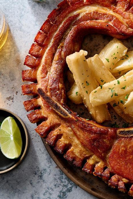 3. Remove chop from water and pat dry. Using a paring knife cut slits in the belly section every inch. This will form the tomahawk look when fried. Place chop in an oven proof pan and rub 2 cups of mojo criollo marinade over the chop. Allow to marinade for an hour. Season outside of chop with cilantro and achiote seasoning.