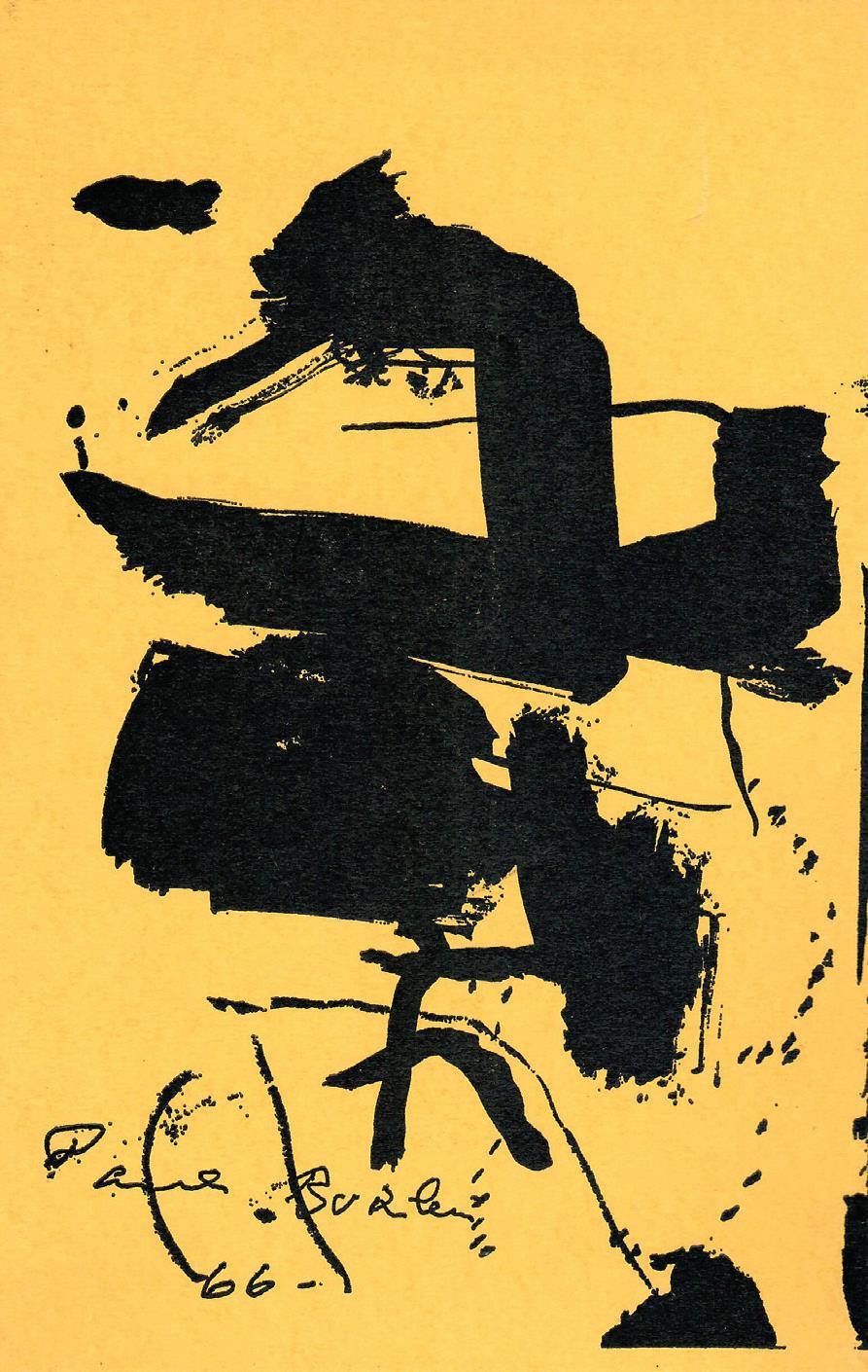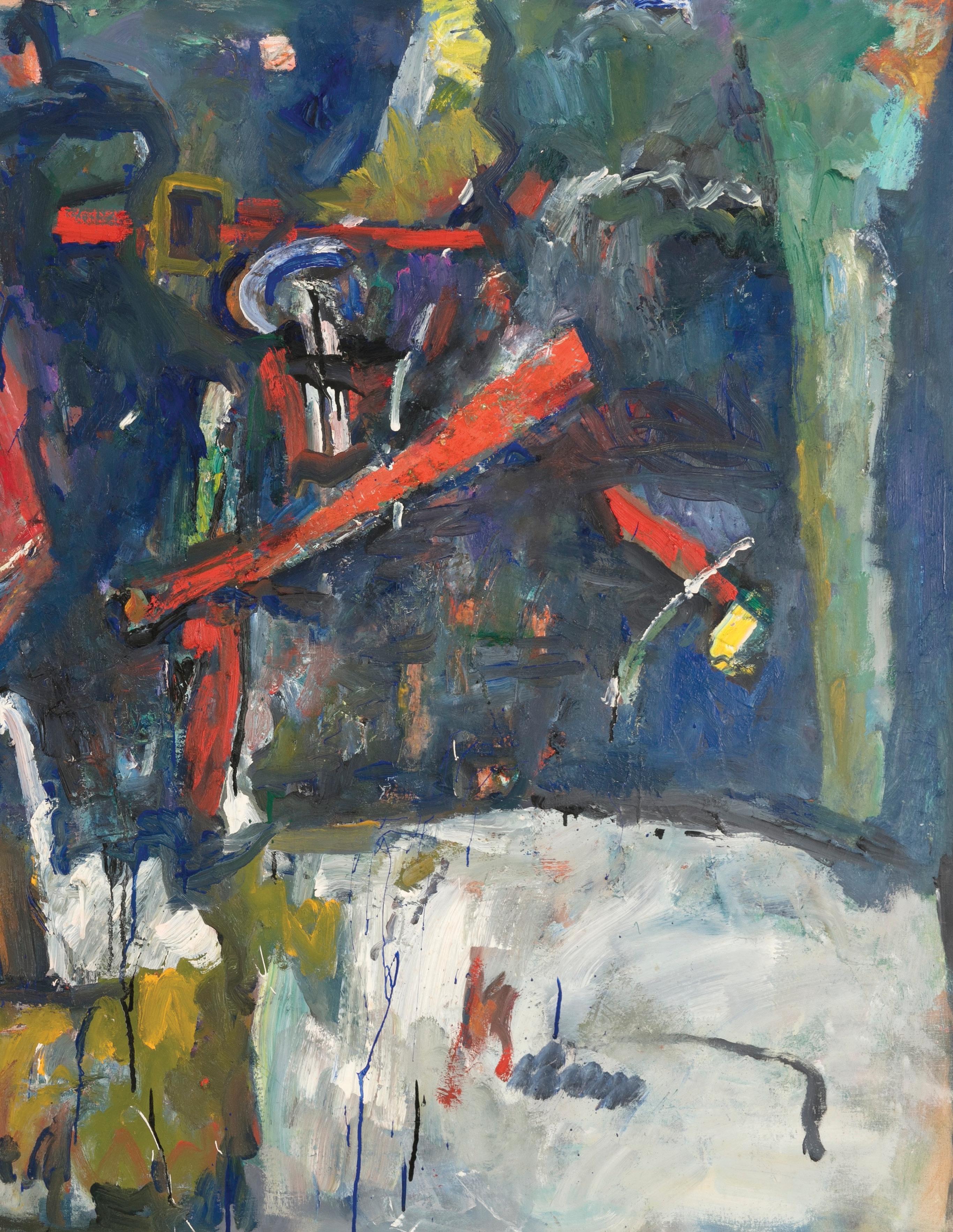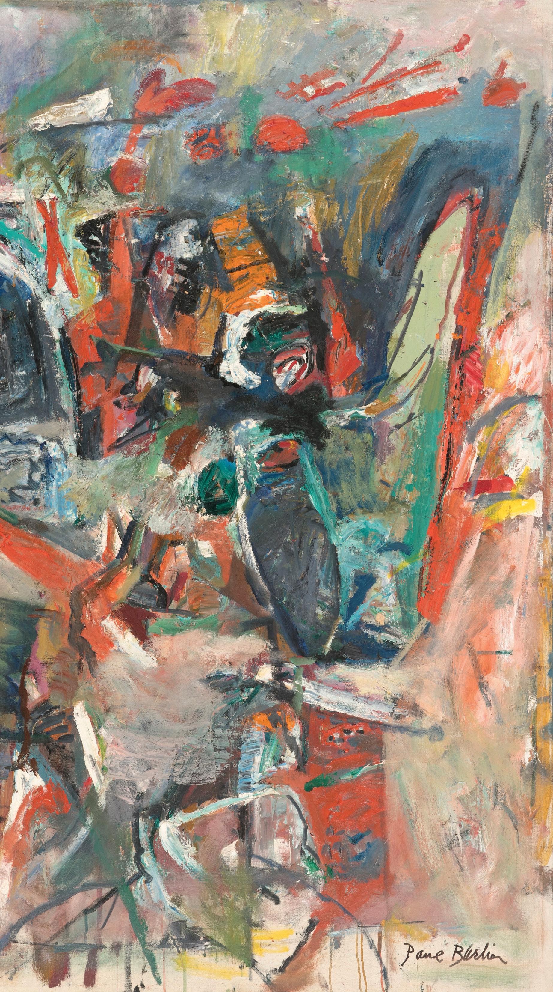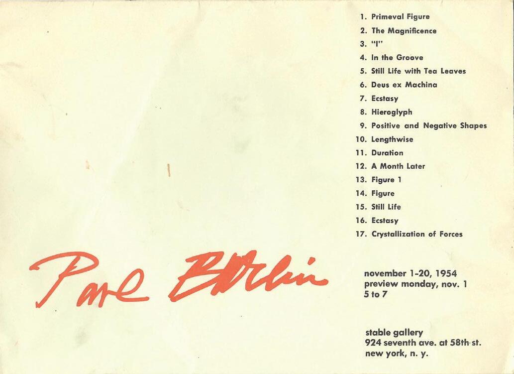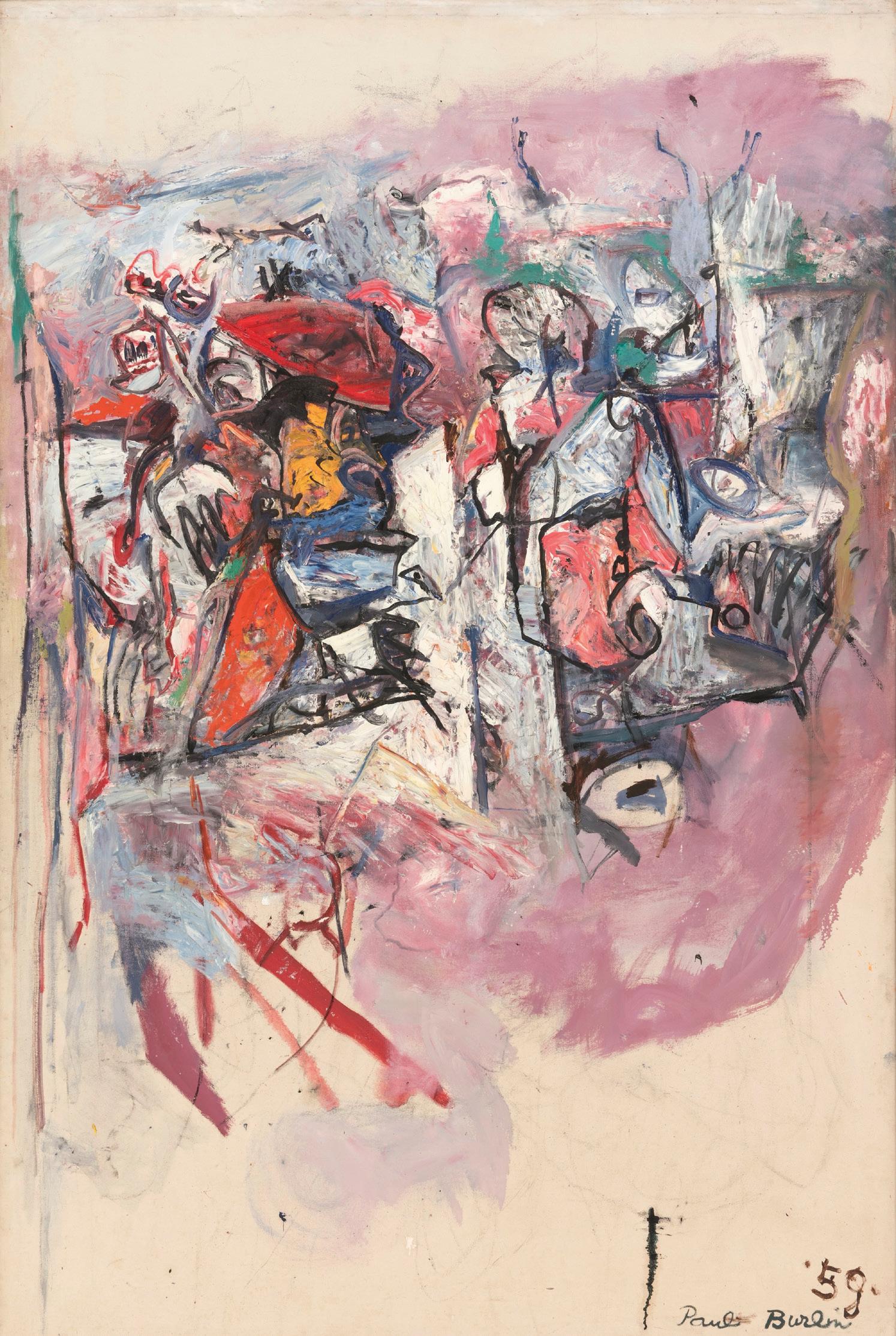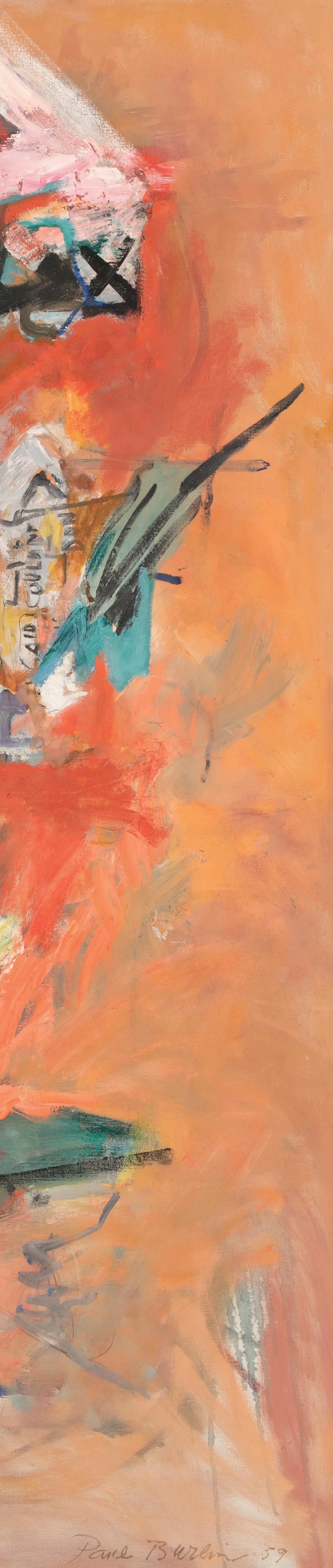 The raw intense complementaries in the recent canvases of Paul Burlin are painted impetuously, yet they well up from deep within themselves, coalescing into mobile forms that make the limitless space dense. Color, that most enigmatic of pictorial elements, rather than line, is used to create structure. In It Is (1959), the image looms from active bluish and greenish whites. A massive centrally located yellow quadrilateral halved by a snaking blue, slides precariously to the left as it thrusts forward aggressively from blue and red. Suspended above it and to the right are tumbling brown and blue fragments, and below, a configuration of calligraphic signs—emergent forms—in the path of a red that bursts in from the right. Burlin takes his stance in chaos but does not succumb to it. Although the off-balance complexes of open forms are in unceasing flux, the shapes, each imbued with its own emotional and pictorial meaning, strain to regroup themselves about some still unknown center of gravity. One senses that Burlin once had more definite ideas about equilibrium, but relinquished them. All that remains is the yearning for order and the hope that it is achievable. Found in the file of miscellaneous papers that he keeps is a quote from Ortega y Gasset: “There is but one way to save a classic; to give up revering him and to use him for our own salvation—that is to lay aside his classicism . . . to make him contemporary, to set his pulse going again with an injection of blood from our own veins, whose ingredients are our passions and our problems.” The turbulence in Burlin’s pictures is a sign of a new attitude to life, of a changed relation between the individual and his environment. As he wrote in 1954: “The artist reflects his age. Raphael had the serenity of the Renaissance behind him . . . a calm immutable balance. This was the period of a belief in man and hence a period of distinguished portraits, for the portraits of the Renaissance were the embodiment of an idea. Today we have no such ideas….We have lost our face….We live in an age of treacherous, harrowing notions of mutability, death and decay. . . . All of the old realities have dissolved . . . all rigidities of form disappear and enter into a new metamorphosis.” Burlin has dedicated himself to finding his “face” —not a particular set of idiosyncratic features, but the changeable physiognomy of a contemporary man.