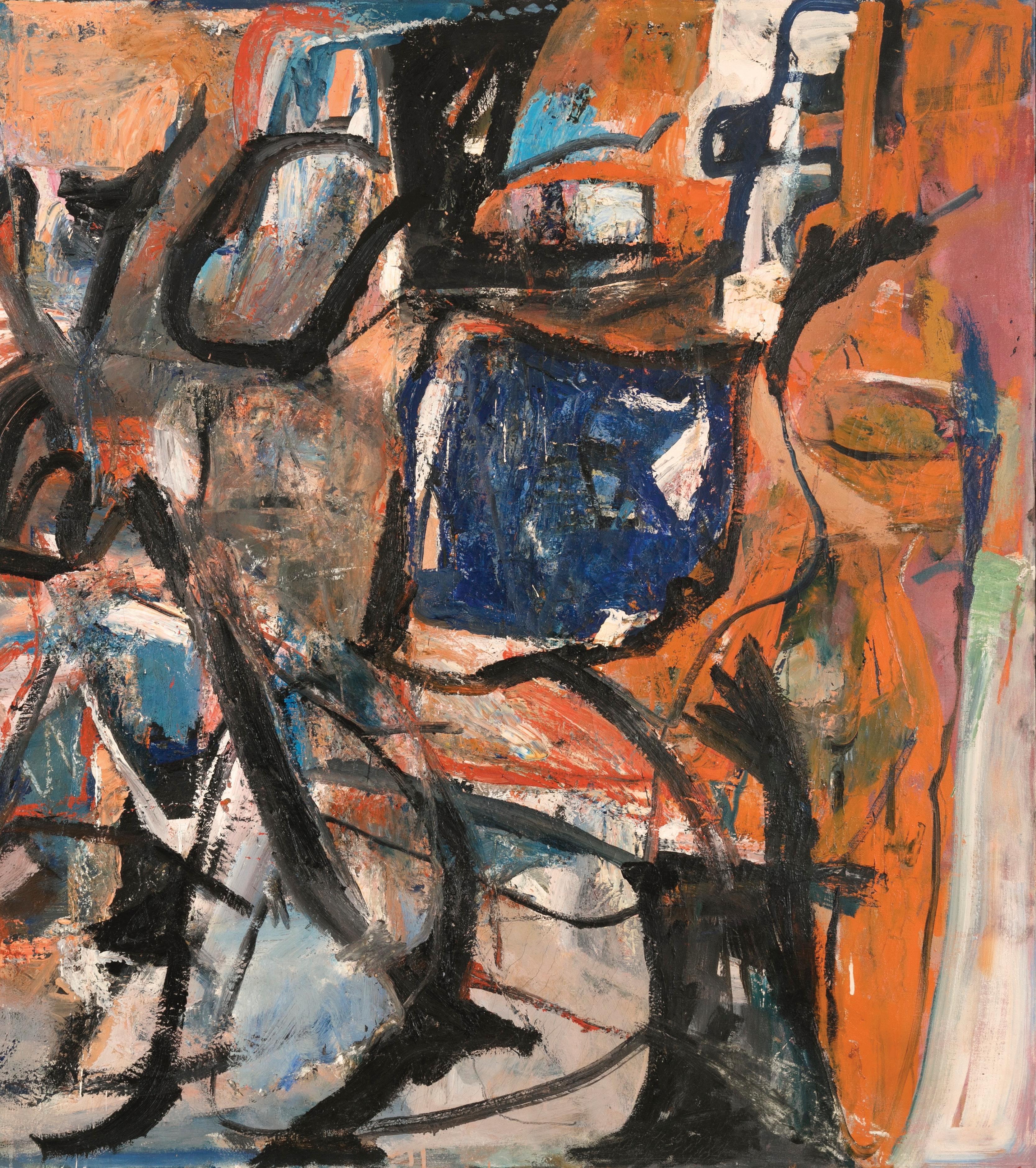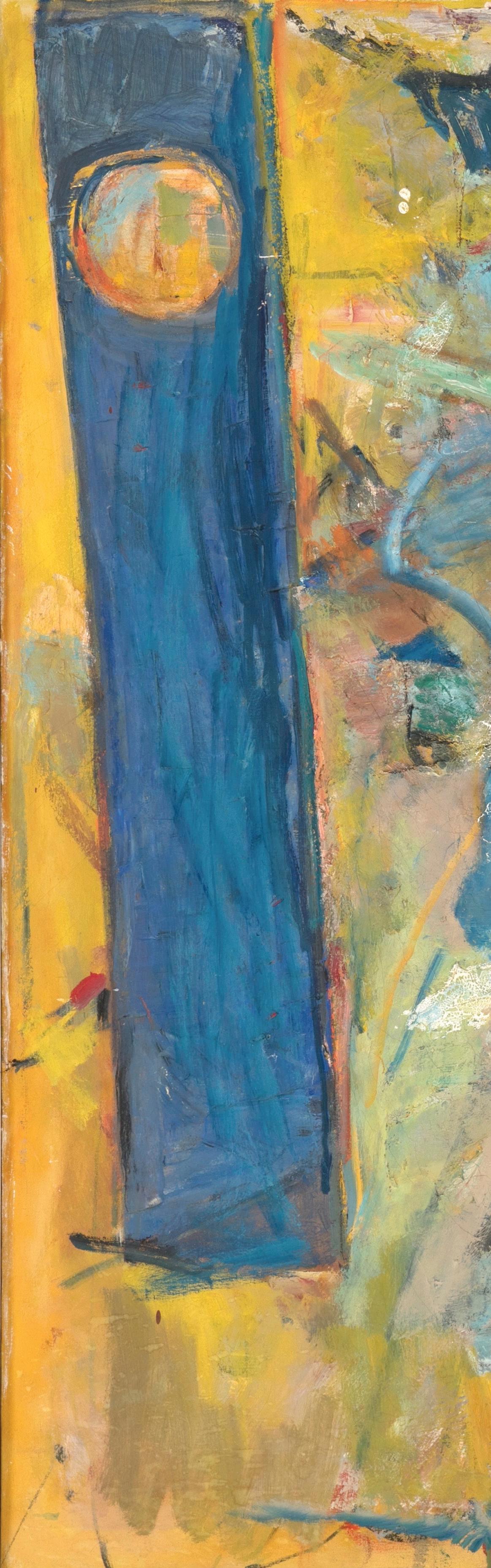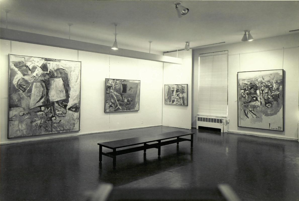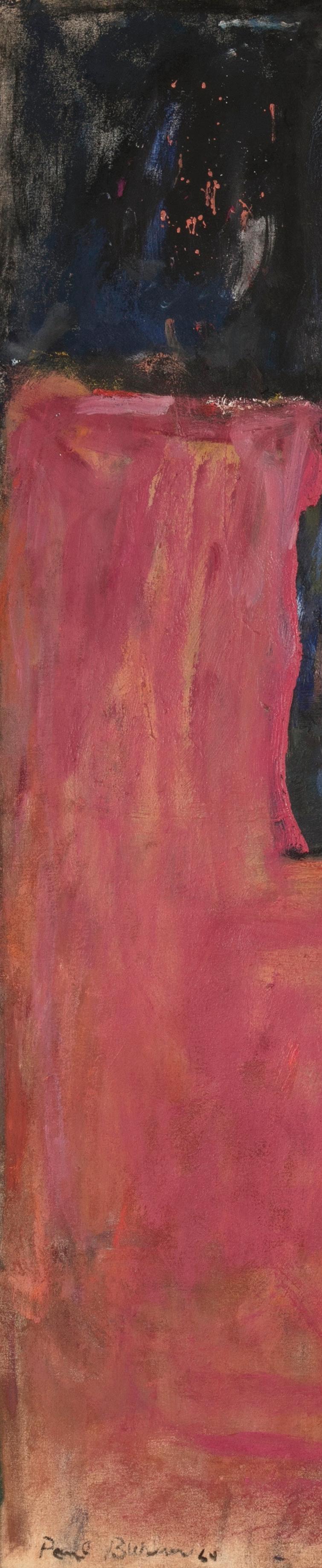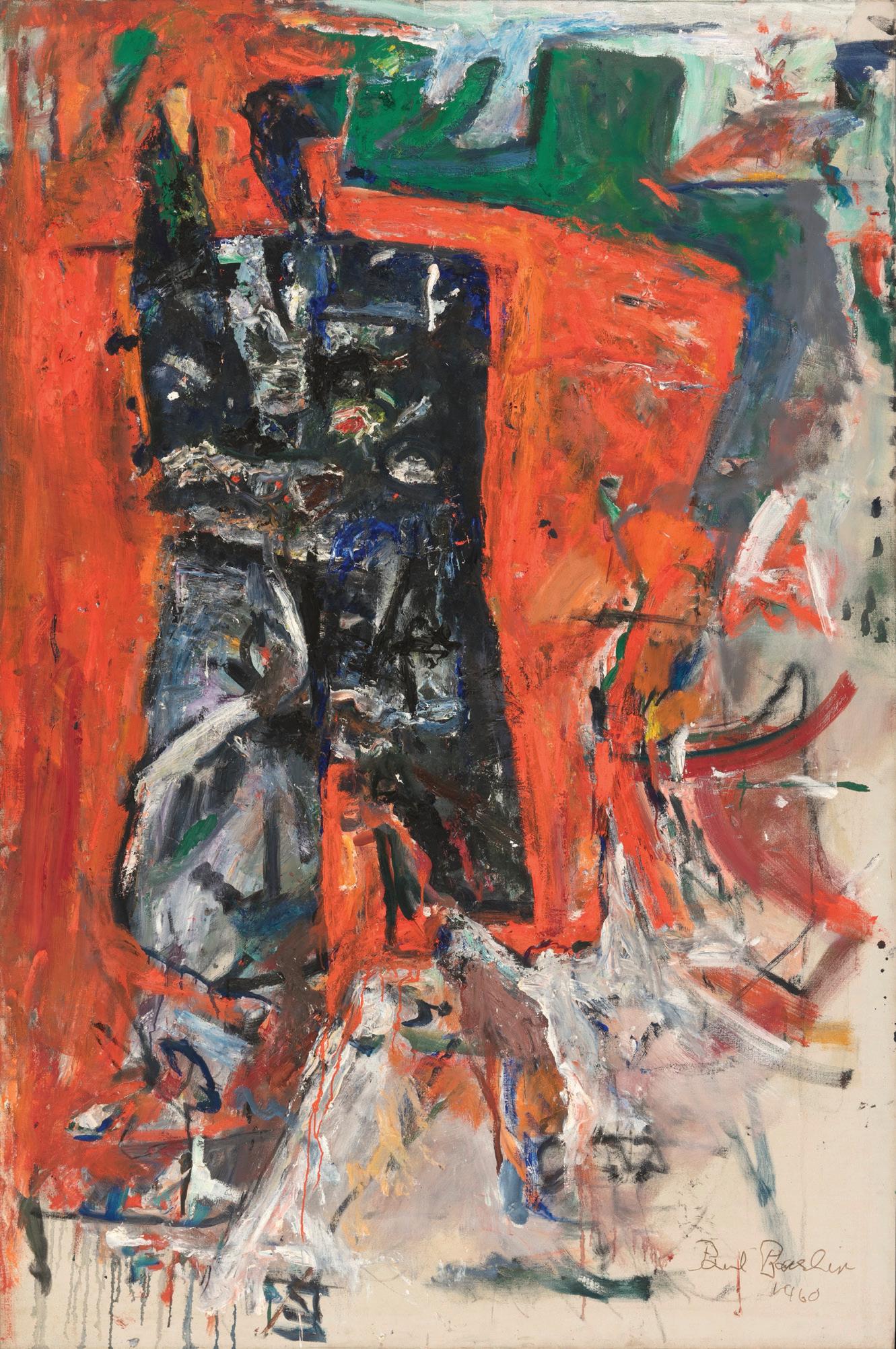 The raw intense complementaries in the recent canvases of Paul Burlin are painted impetuously, yet they well up from deep within themselves, coalescing into mobile forms that make the limitless space dense. Color, that most enigmatic of pictorial elements, rather than line, is used to create structure. In It Is (1959), the image looms from active bluish and greenish whites. A massive centrally located yellow quadrilateral halved by a snaking blue, slides precariously to the left as it thrusts forward aggressively from blue and red. Suspended above it and to the right are tumbling brown and blue fragments, and below, a configuration of calligraphic signs—emergent forms—in the path of a red that bursts in from the right. Burlin takes his stance in chaos but does not succumb to it. Although the off-balance complexes of open forms are in unceasing flux, the shapes, each imbued with its own emotional and pictorial meaning, strain to regroup themselves about some still unknown center of gravity. One senses that Burlin once had more definite ideas about equilibrium, but relinquished them. All that remains is the yearning for order and the hope that it is achievable. Found in the file of miscellaneous papers that he keeps is a quote from Ortega y Gasset: “There is but one way to save a classic; to give up revering him and to use him for our own salvation—that is to lay aside his classicism . . . to make him contemporary, to set his pulse going again with an injection of blood from our own veins, whose ingredients are our passions and our problems.” The turbulence in Burlin’s pictures is a sign of a new attitude to life, of a changed relation between the individual and his environment. As he wrote in 1954: “The artist reflects his age. Raphael had the serenity of the Renaissance behind him . . . a calm immutable balance. This was the period of a belief in man and hence a period of distinguished portraits, for the portraits of the Renaissance were the embodiment of an idea. Today we have no such ideas….We have lost our face….We live in an age of treacherous, harrowing notions of mutability, death and decay. . . . All of the old realities have dissolved . . . all rigidities of form disappear and enter into a new metamorphosis.” Burlin has dedicated himself to finding his “face” —not a particular set of idiosyncratic features, but the changeable physiognomy of a contemporary man.