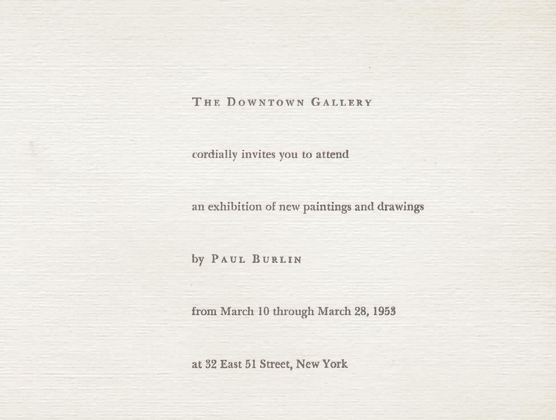 NEBRASKA ART ASSOCIATION, SIXTY-SECOND ANNUAL EXHIBITION, 1972. NEW YORK MUSEUM OF MODERN ART, PAINTING AND SCULPTURE IN MOMA, 1948, P 234, 1 ILLUSTRATION. ART IN PROGRESS-15TH ANNUAL EXHIBITION, 1941, P 62, 219, 1 ILLUSTRATION. PAUL BURLIN (1886-1969) LATE PAINTINGS. DEC-JAN. 1970-71.