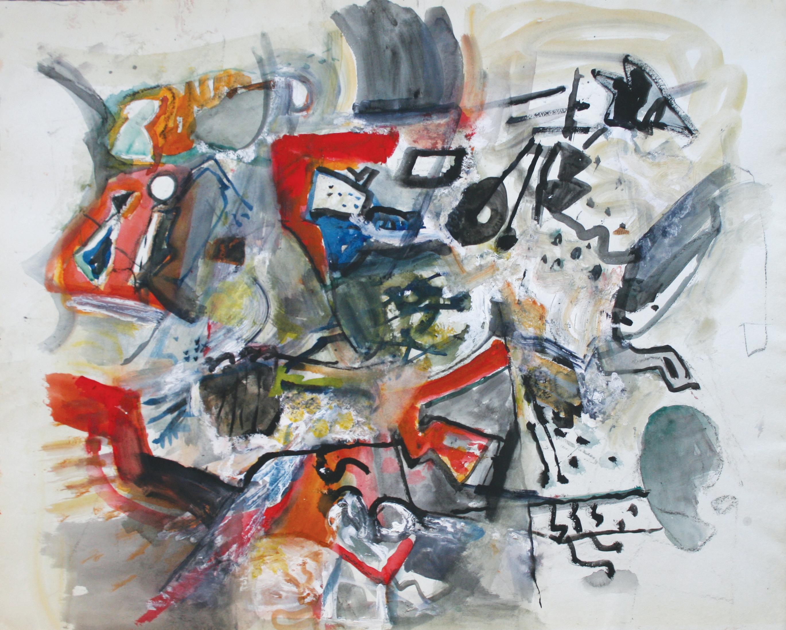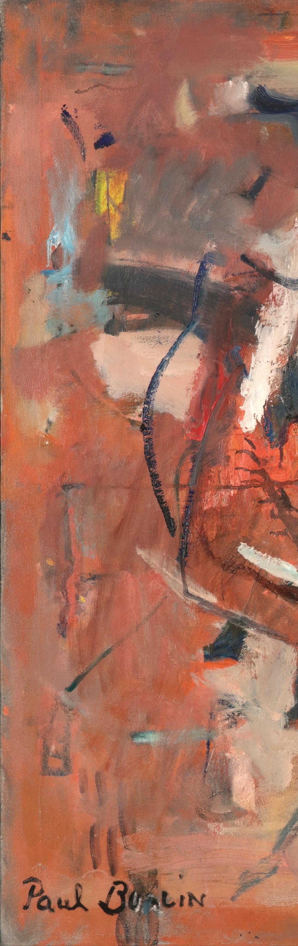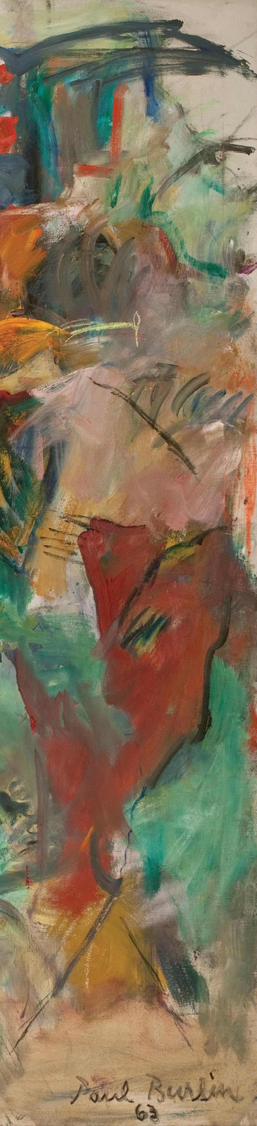 Burlin also got to know many of the other artists of the school of Paris. Leo Stein became a close friend and wrote the introductory statement for one of Burlin’s projected shows in Paris. Despite the excitement of the Parisian art scene, the overall impression that remained with Burlin after his twelve-year sojourn there was that he felt like an outsider, an alien. The need for roots caused him to return to America in 1932. During the middle and late 1940s Burlin began to pay less attention to subject matter and more attention to the expressive possibilities of painting in itself. He turned to mythology for themes but was increasingly concerned with the daemonic spirit of myths which he tried to infuse into the act of creation. Painting for him became a kind of incantation. In the brochure for his 1946 show, he wrote “The magic itself of the painting aims to destroy visual reality and the primitive colors shape themselves into a reality of their own.” The example of Kandinsky’s early improvisations was important in Burlin’s development at this time. He was stimulated by Kandinsky’s audacity—his daring to base his pictures on “inner necessity” alone, and his creation of a subjective, intangible space so radically different from that of past art. He was also attracted by Picasso’s barbaric paintings of women in the 1930s. These elements are increasingly felt in Burlin’s own canvases, in the emotional distortions and cacophonous complementaries. In “Young Man Alone With His Face” (1944) all of the pictorial attributes found in later abstractions are already in evidence. In the early 1950s, Burlin carried his Expressionism into abstraction. The world of natural appearances was completely swallowed up in the vehemence of the painting. In this sense, Burlin can be called an AbstractExpressionist in a way that many artists now classified under the label but who arrived at the new art via Cubism and Surrealism cannot. The evolution in Burlin’s work was gradual and coherent; it lasted over a period of a dozen years. His change was not a breakthrough, but an attempt to avoid being trapped by a style he had already achieved. The new approach offered him fresh points of departure, a more direct and immediate method of arriving at intensely personal images.