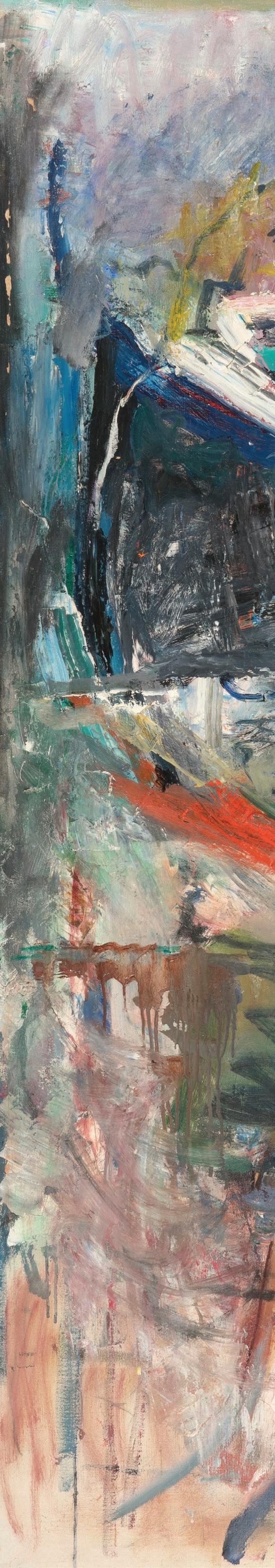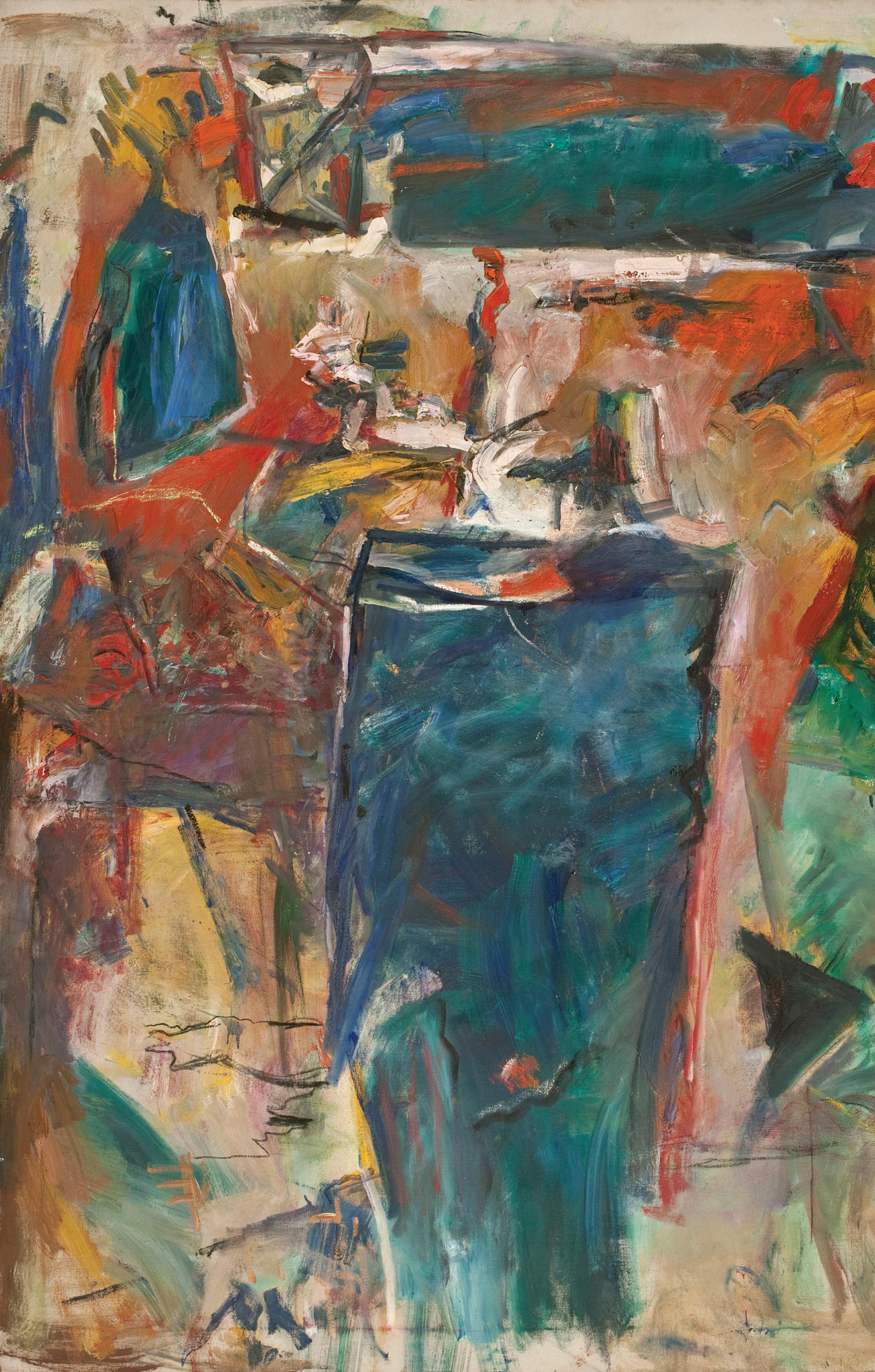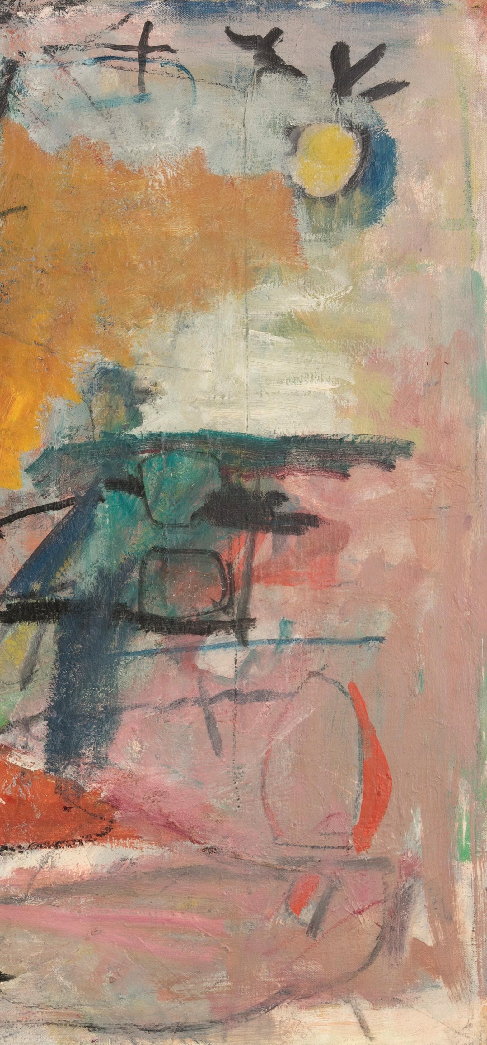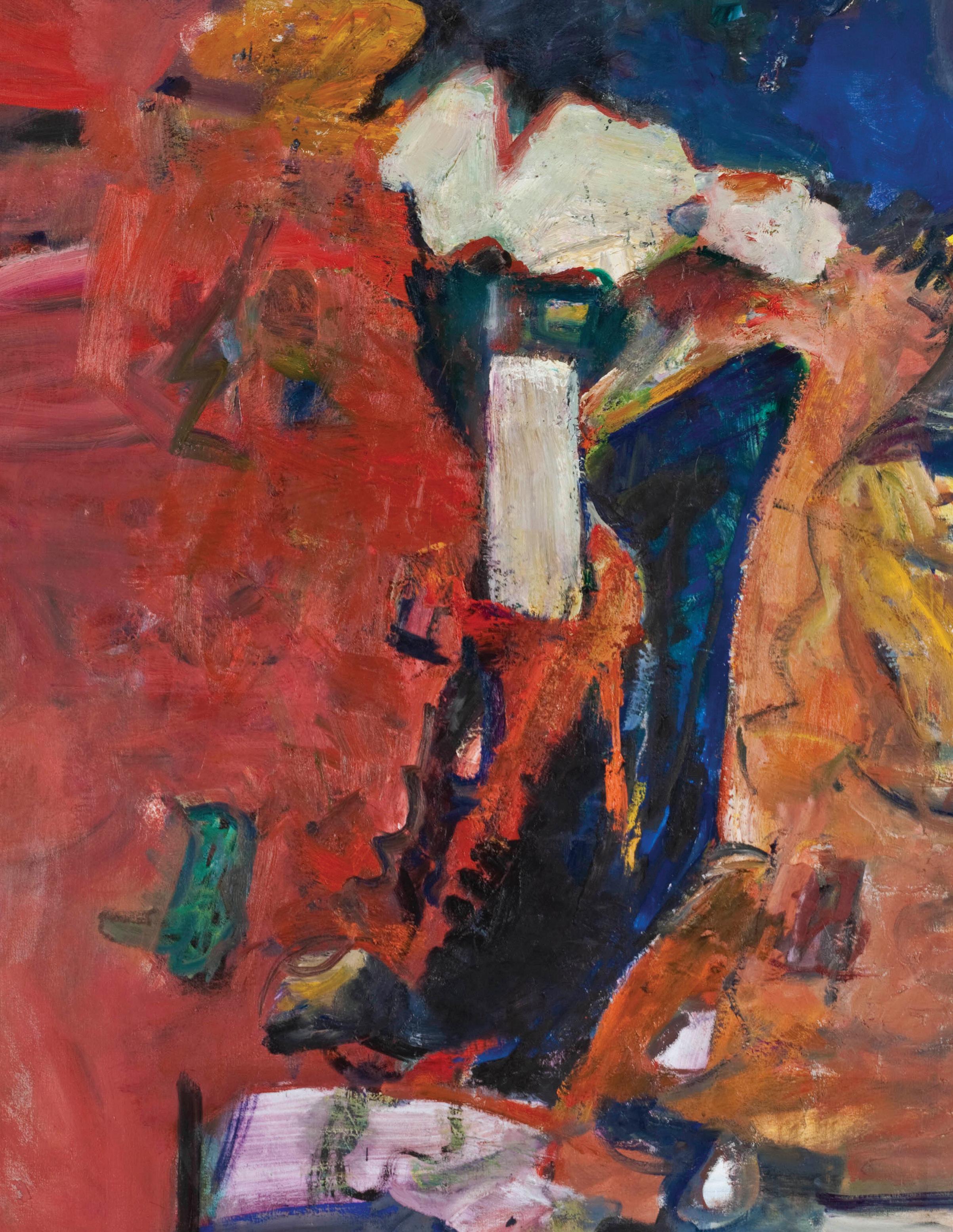 Burlin also got to know many of the other artists of the school of Paris. Leo Stein became a close friend and wrote the introductory statement for one of Burlin’s projected shows in Paris. Despite the excitement of the Parisian art scene, the overall impression that remained with Burlin after his twelve-year sojourn there was that he felt like an outsider, an alien. The need for roots caused him to return to America in 1932. During the middle and late 1940s Burlin began to pay less attention to subject matter and more attention to the expressive possibilities of painting in itself. He turned to mythology for themes but was increasingly concerned with the daemonic spirit of myths which he tried to infuse into the act of creation. Painting for him became a kind of incantation. In the brochure for his 1946 show, he wrote “The magic itself of the painting aims to destroy visual reality and the primitive colors shape themselves into a reality of their own.” The example of Kandinsky’s early improvisations was important in Burlin’s development at this time. He was stimulated by Kandinsky’s audacity—his daring to base his pictures on “inner necessity” alone, and his creation of a subjective, intangible space so radically different from that of past art. He was also attracted by Picasso’s barbaric paintings of women in the 1930s. These elements are increasingly felt in Burlin’s own canvases, in the emotional distortions and cacophonous complementaries. In “Young Man Alone With His Face” (1944) all of the pictorial attributes found in later abstractions are already in evidence. In the early 1950s, Burlin carried his Expressionism into abstraction. The world of natural appearances was completely swallowed up in the vehemence of the painting. In this sense, Burlin can be called an AbstractExpressionist in a way that many artists now classified under the label but who arrived at the new art via Cubism and Surrealism cannot. The evolution in Burlin’s work was gradual and coherent; it lasted over a period of a dozen years. His change was not a breakthrough, but an attempt to avoid being trapped by a style he had already achieved. The new approach offered him fresh points of departure, a more direct and immediate method of arriving at intensely personal images.