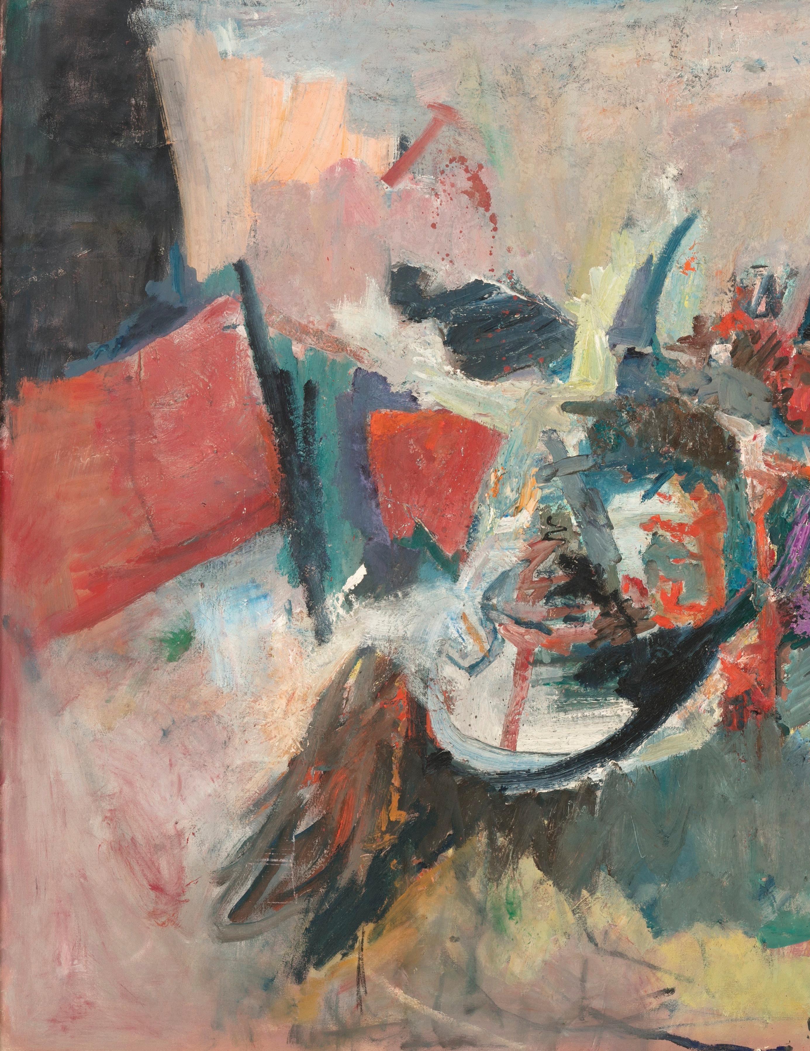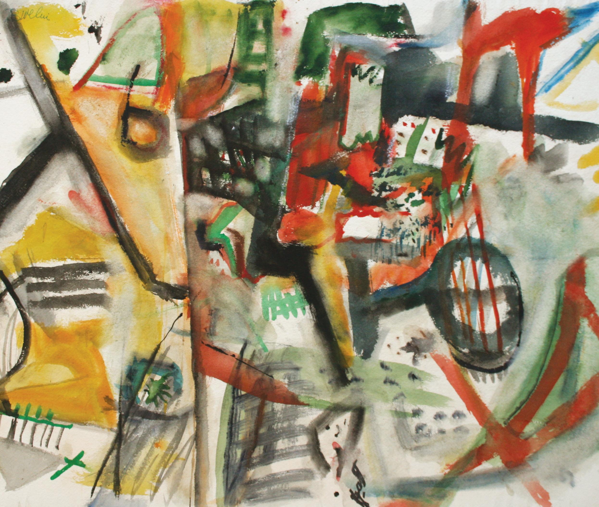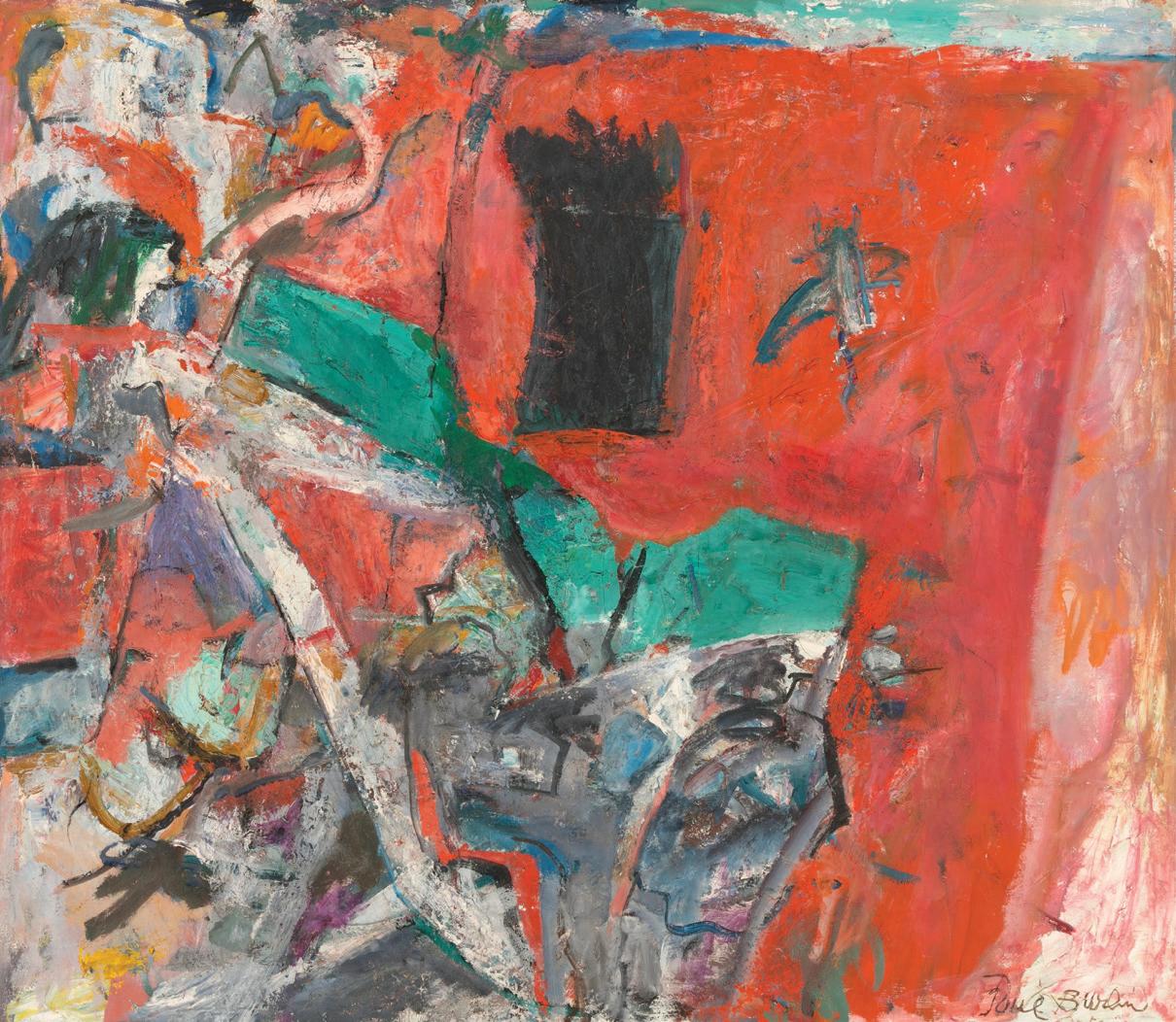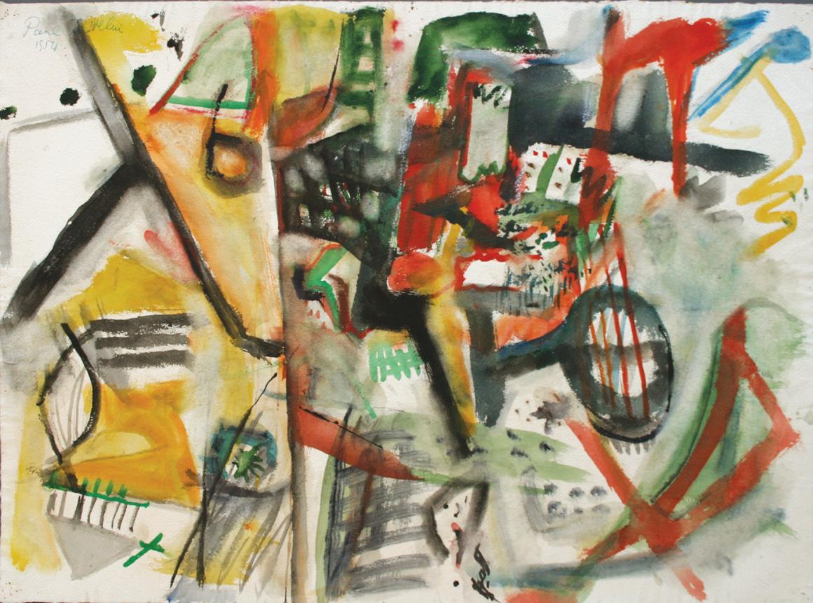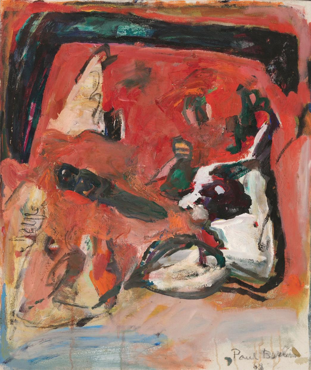 Burlin’s turn to abstraction took place when he was approaching his seventieth year, a testimonial to the youthful outlook of this artist. His constant search and development has not stopped to this day. “Quiescent Monster,” one of Burlin’s recent pictures, has a novel massiveness and simplicity. The violent carmine and green expanses suggest uncharted continents that have yet to be explored. The newness in Burlin’s painting is earned; it is the result of a lifetime committed to exploring all that which is vital in art.