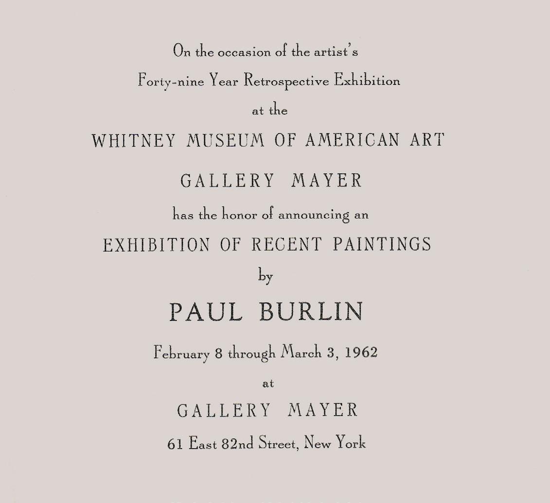 GRACE BORGENICHT GALLERY, NEW YORK. RECENT PAINTINGS, PAUL BURLIN 1963. PAUL BURLIN 1965. PAUL BURLIN LAST WORKS 1971. PAUL BURLIN LATE PAINTINGS, 1981.