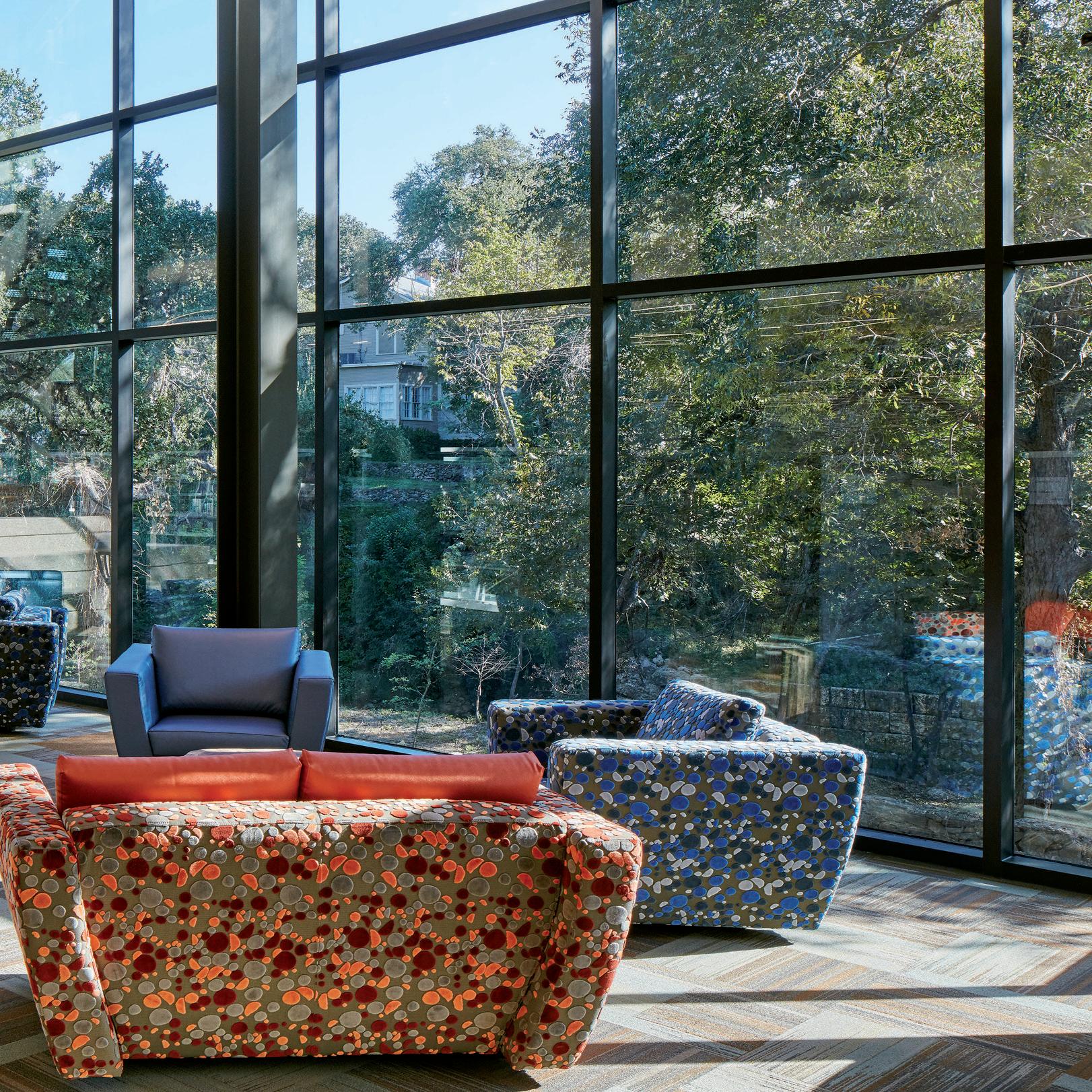 The library’s cantilevered decks extend over Walnut Creek, offering elevated views and access to a nearby hike-and-bike trail. A glass-enclosed quiet room, nestled among pecan tree branches, provides a treehouse-like experience for visitors.