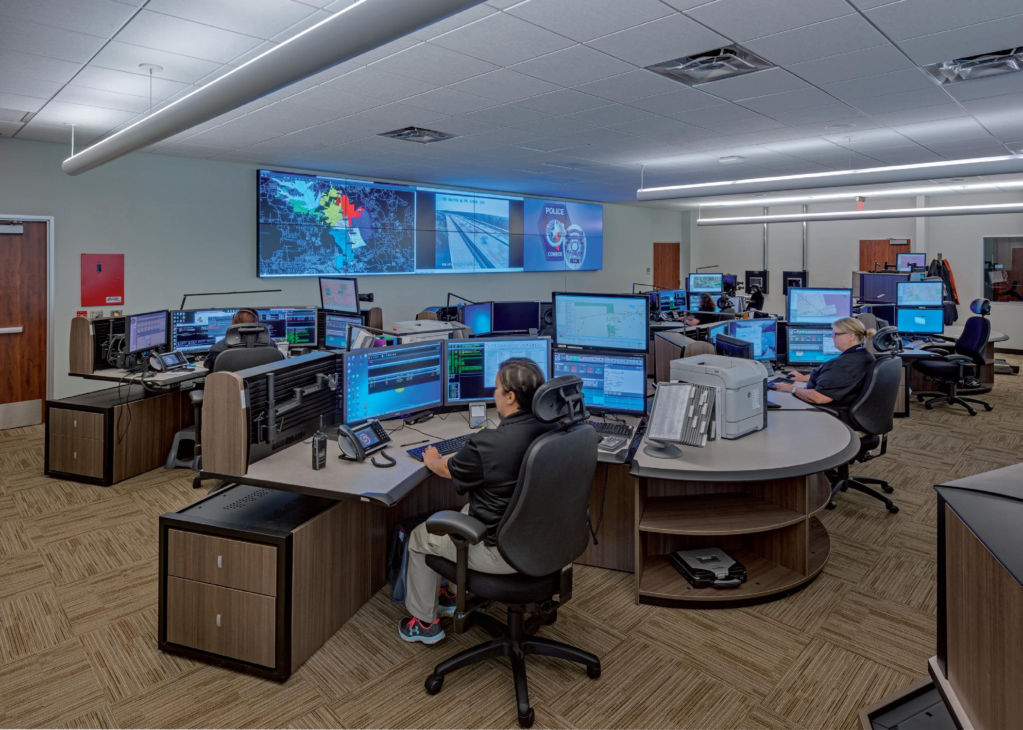The facility encompasses 9-1-1 emergency communications and city Information Technology Services (ITS) department common areas. The ITS department is a 24/7 operation that includes a dispatch center, consolidated radio/9-1-1 equipment room, communication coordinator office, and data center. The operations center features a three-level security system that integrates exterior motion detection equipment, IP cameras, and HID scanners.