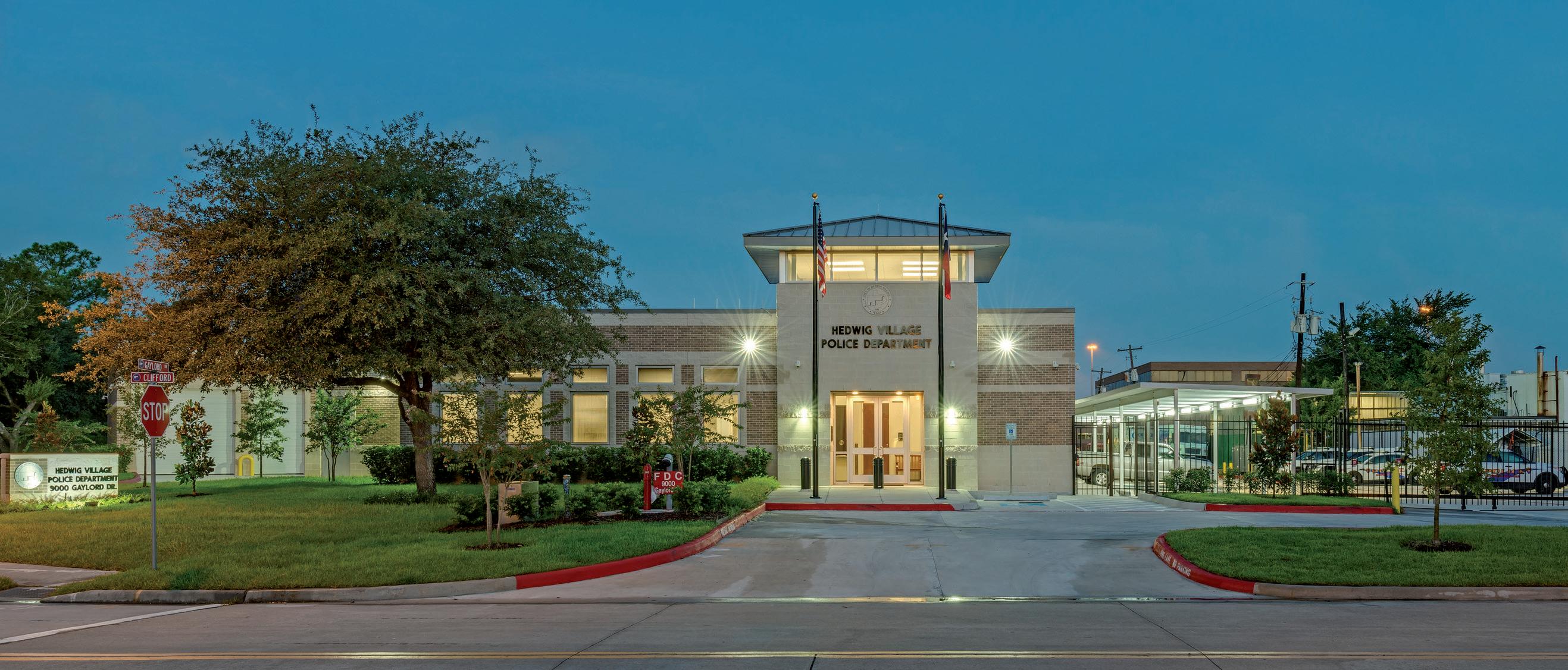 After experiencing growth over the past decade, Hedwig Village, a small municipality 10 miles from Downtown Houston, had grown out of its existing 7,500-squarefoot police station facility built in 1984. PGAL was commissioned by the city to design a 12,065-square-foot replacement station. The exterior design of the building is contextual with the neighborhood and adjacent City Hall while maintaining a sense of authority.