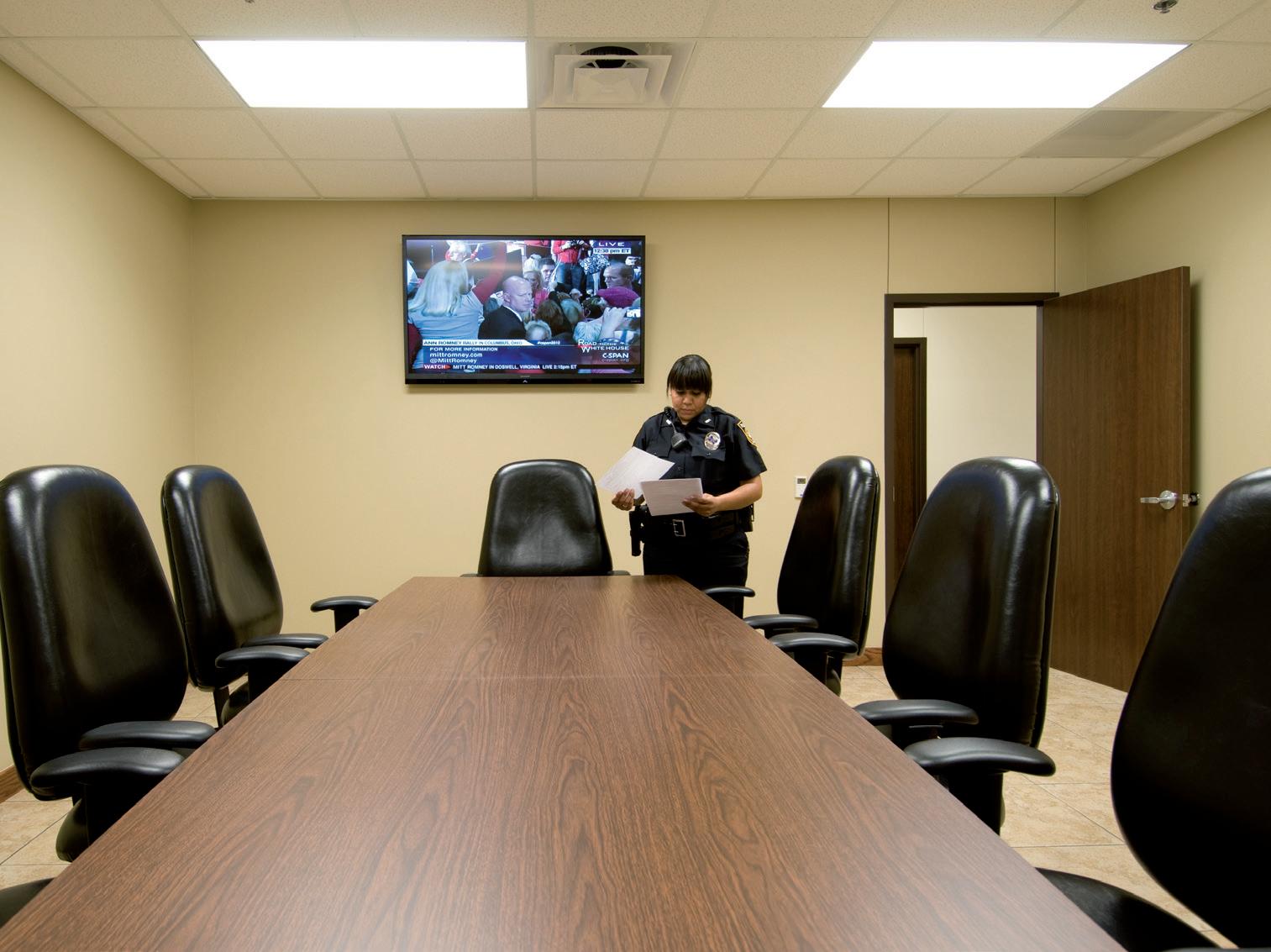 The facility includes a community meeting/conference room off of the lobby that seats up to 100 citizens with access to public restrooms. All other spaces are secured and do not allow public access.