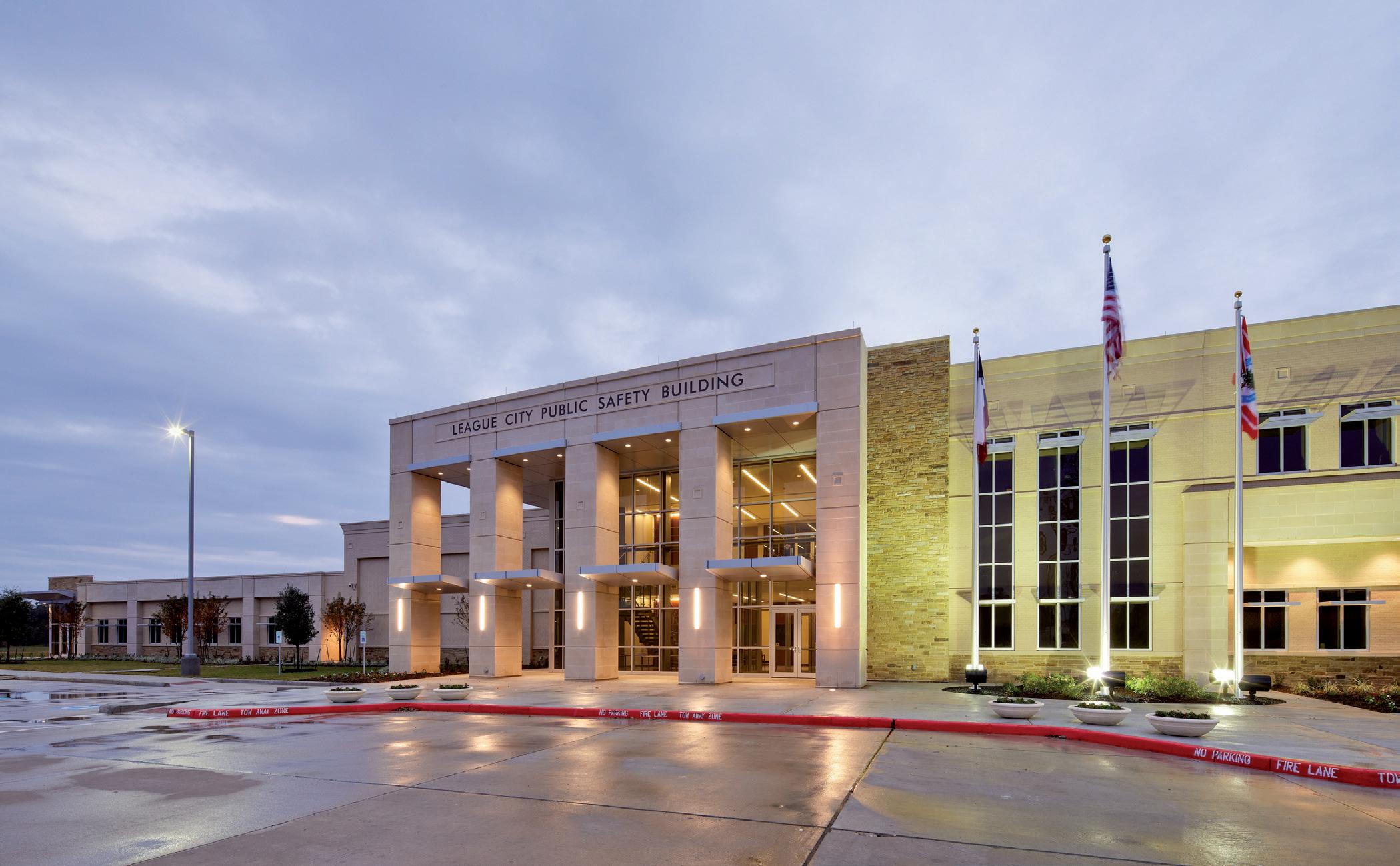 This 74,000-square-foot League City Public Safety Building is a state-of-the-art, multipurpose, fortified facility. The complex includes the city’s police department, jail, and fire administration, conference and meeting rooms, information technology, records, 9-1-1 dispatch and emergency operations center, SWAT and officers’ armory, evidence storage, and crime lab. Additional program includes an 80-person training room, fitness room, locker rooms, defensive tactics training, and briefing room.