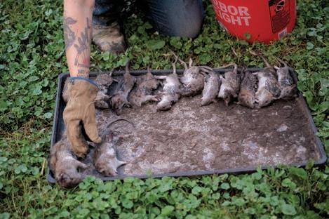 “Bob is a champ ” one of the property owners says. fter a slow but steady start in the first hour, the dogs “probably caught like rats in minutes.” t the end of every ob, has a tradition of taking a group photo with all the rats laid out on a tray. oday, they celebrate an even kills.