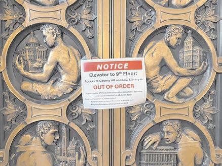 The inoperative elevators are a symptom of larger problems the building has with its mechanical systems and management. An agreement signed in 1915 divvies up responsibilities for maintenance and repair between the city and the county. There are inoperative windows, some of them with broken panes held together with duct tape. One court clerk not authorized to speak with the press compares the sound of the air conditioner in their office to the sound made by the steam engine powering the boat in the movie The African Queen Pittsburgh City Paper requested a copy of the original intergovernmental agreement. The city declined to provide a copy without completion of a Rightto-Know Law request, which triggered a 30-day waiting period. Allegheny County spokesperson Abigail Gardner said she was unable to get a copy from the County Manager’s office, and she also suggested completing a RTKL request to “trigger a wider search.”