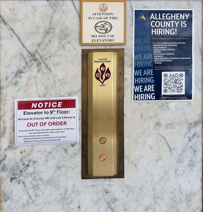 The City-County Building is where residents get marriage licenses and file wills. It also houses the Pittsburgh City Council, the mayor’s office, the Allegheny County Law Library, and courtrooms. Inoperative and unreliable elevators vex visitors and people who work in the building, especially those who need to access the ninth floor law library and Allegheny County Department of Human Relations.