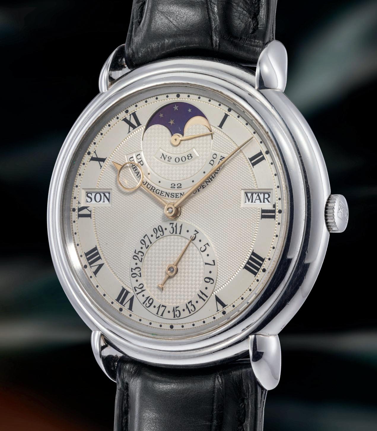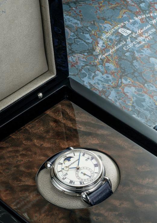 URBAN JÜRGENSEN — A sublime, extremely elegant and highly collectible platinum perpetual calendar automatic wristwatch with power reserve indication, moonphases, certificate and presentation box