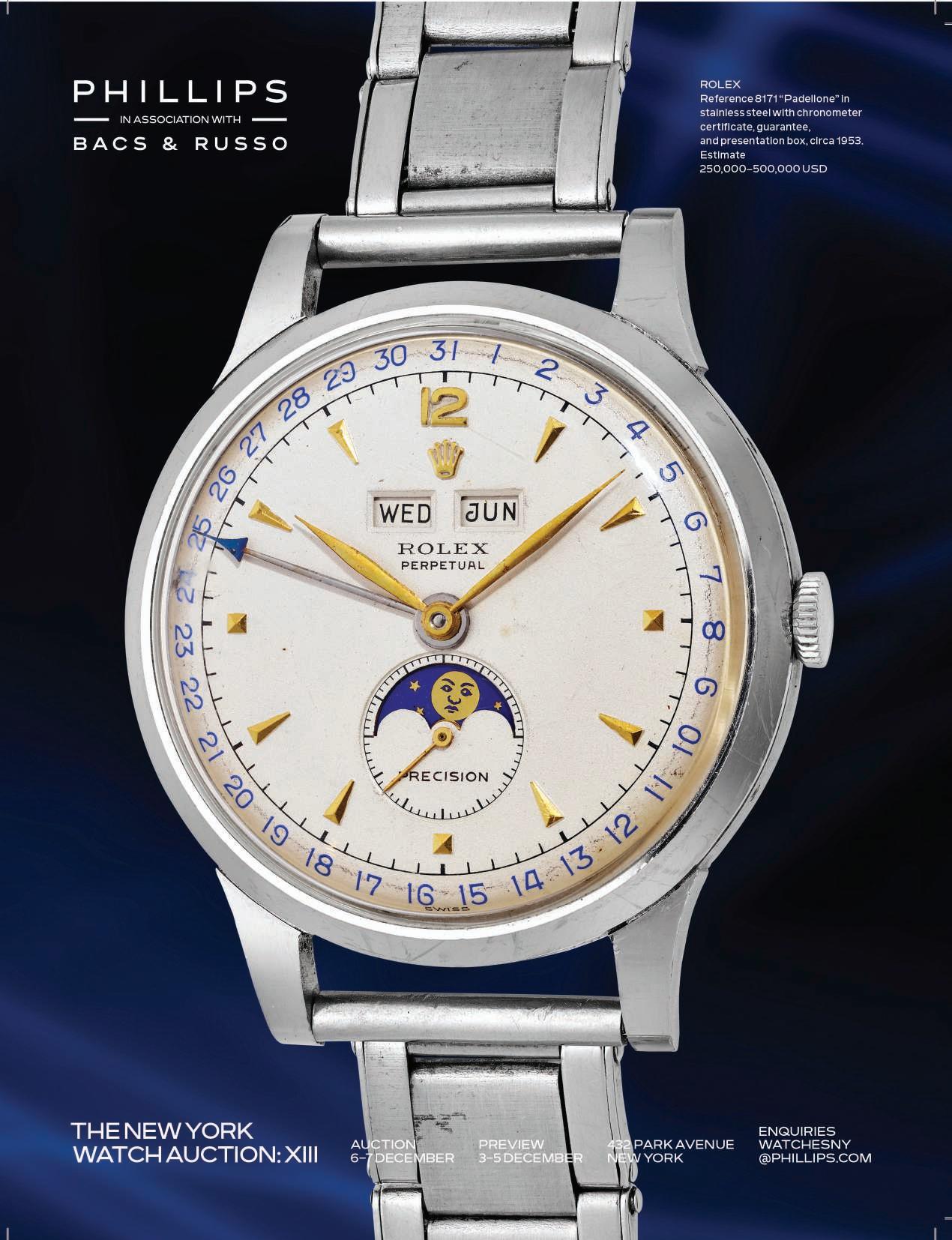 The Conditions of Sale and Authorship Warranty set out below govern the relationship between bidders and buyers, on the one hand, and Phillips Fine Watches Limited (Geneva branch) registered in Geneva under number 380214667 (“Phillips”) and sellers, on the other hand. All prospective buyers should read these Conditions of Sale, the Important Notices immediately following the Guide for Prospective Buyers and the Authorship Warranty carefully before bidding.