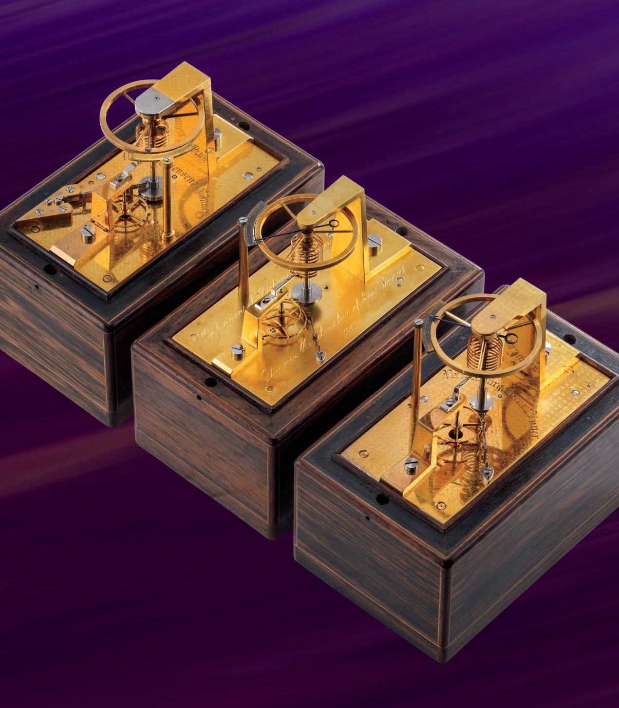 The present set of three escapements was made by Jürgensen’s workshop apprentices in the mid 19th Century. Each functioning escapement is housed in a glass and gilt brass vitrine atop a fine wooden base.