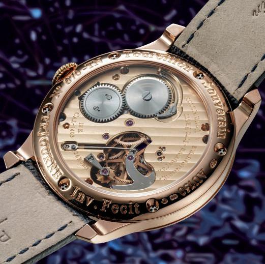 For the first time Ferdinand Berthoud opened the dial allowing a view on a highly architectural movement Offset, between 1 and 2 o’clock, the hours and minutes are displayed on an openworked counter, revealing the essential components of the calibre: the barrel and fusée connected by a chain; the split bimetallic Guillaume balance; a circular balance bridge supporting the shock absorber featuring two diamond endstones, one on the front and one on the back of the movement, like those of Berthoud’s Astronomical Watch No. 3; as well as a 50-hour power reserve indicator engraved on the mainplate.