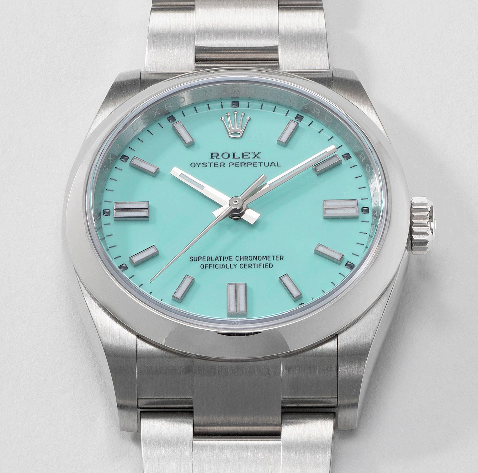 勞力士,「 Oyster Perpetual 36」型號 126000,精細, 精鋼自動鏈帶腕錶,備中心秒針、「Tiffany Blue」藍色 漆面錶盤,約 2020 年製。附原裝證書、錶盒、配件