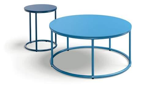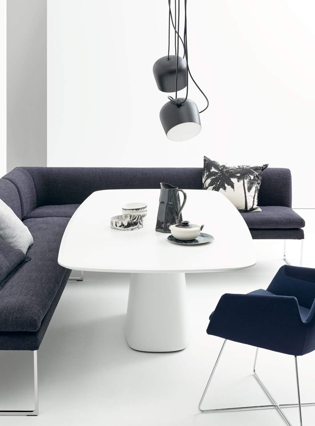 288 cm, fabric 10081 sea, metal skids lacquered in F02 platin; Roc easy chair, fabric 7257 jeans blue; Sting side tables, diameter 100 cm top S02 marble, diameter 50 cm top glass underside lacquered in M20 black, feet lacquered in F05 black
