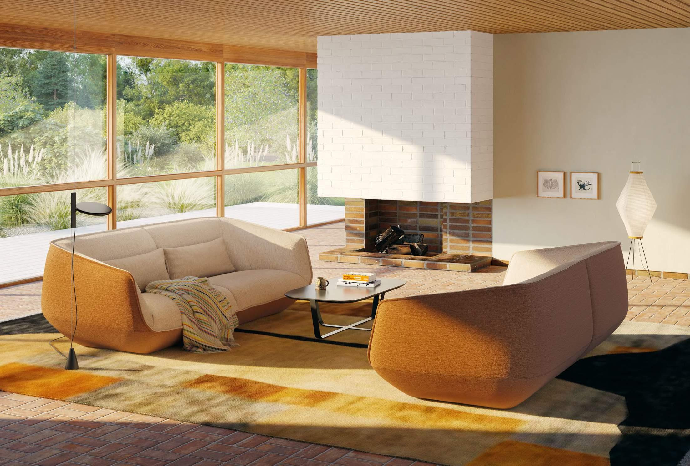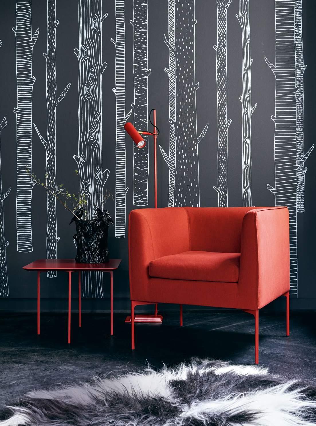 Conseta openbase, 292 cm wide, fabric 8189 brick red, skids lacquered; Shrimp chair, fabric 9084 woodruff green, shell and base lacquered; Sting side table, diameter 50 cm, Sting coffee table diameter 100 cm, tops and feet lacquered