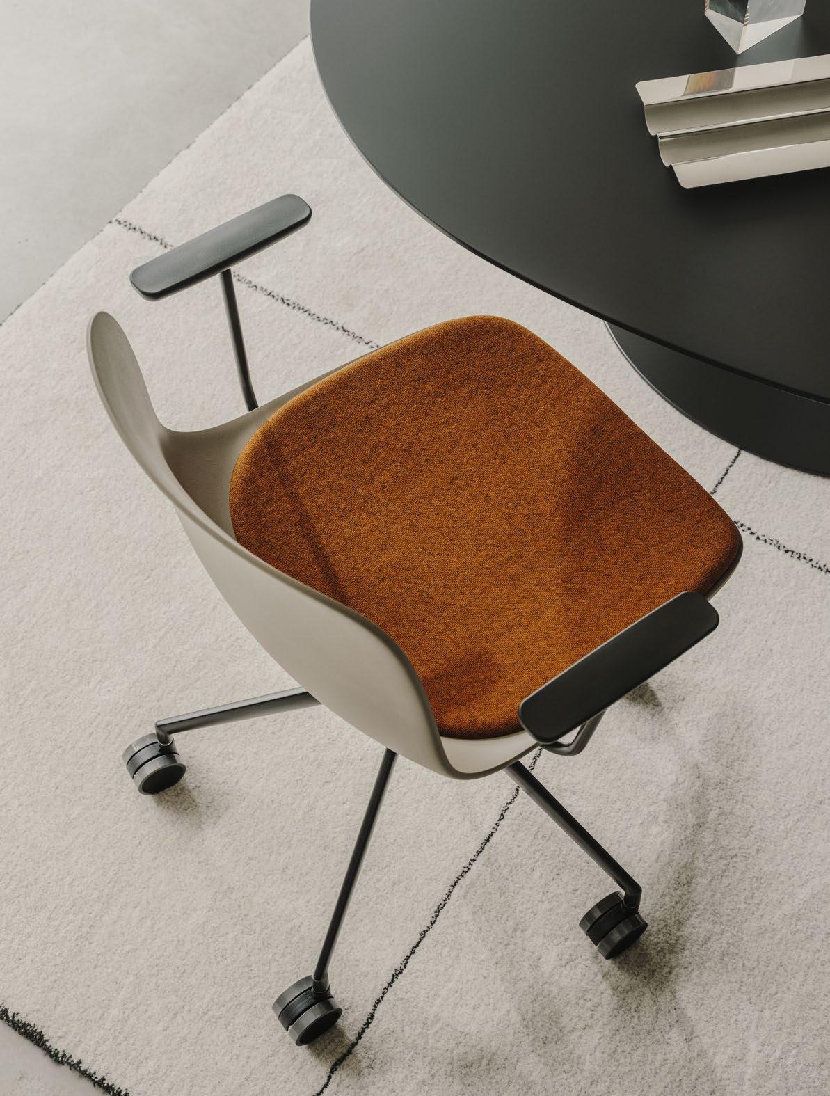 A meeting should bring together, not divide. Also visually. The RONDÒ table smoothes out differences with its attractive rounded profile. The central support makes it easy to sit everyone around it. And its adjustable height and colour versions make it ideal for different needs. The SEELA chair is just as versatile. A lightweight polypropylene shell is the base for a wood, fabric or polypropylene insert built into the seat. The insert is removable and can be easily changed, allowing the chair to be renewed over time, playing with colours or adapting it to new needs, thereby maximising its life cycle. Available with various base supports and accessories, SEELA can be fully upholstered, with the insert in a contrasting material if required.