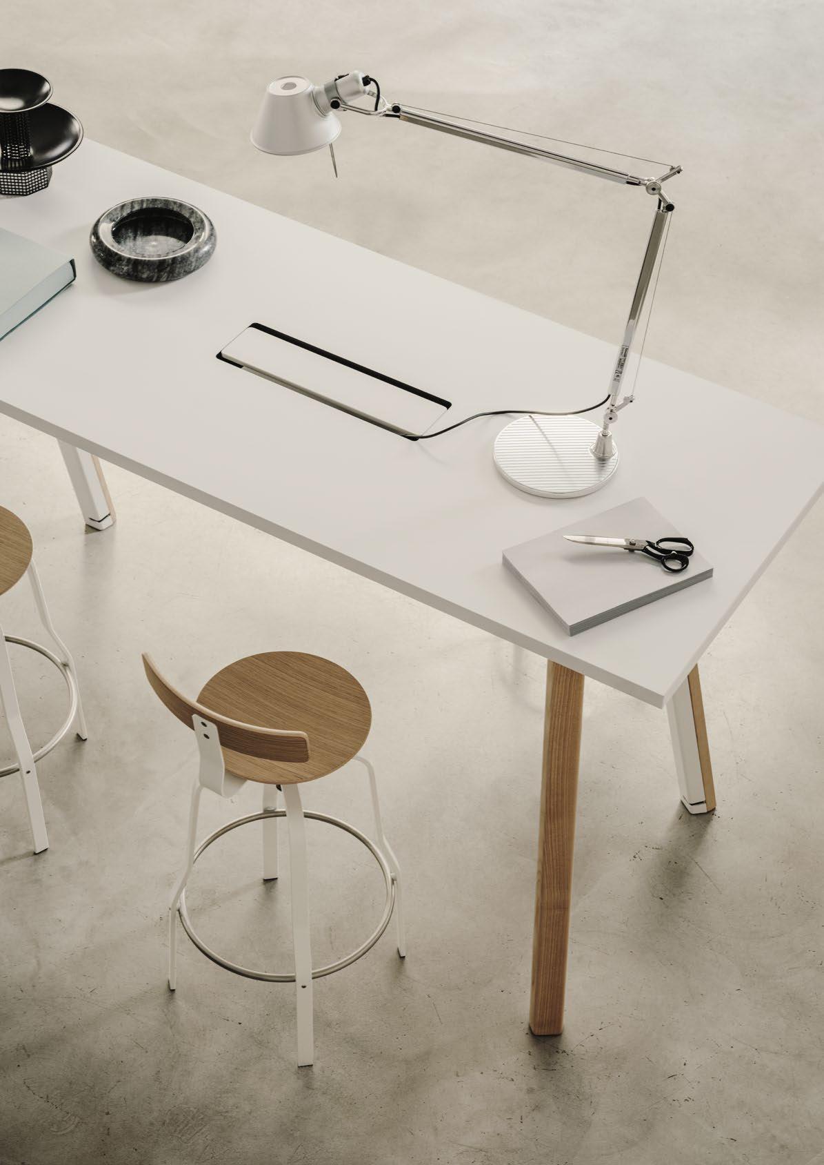 New workstations can be easily created with the ORI table system. Two different heights, tops in various shapes and sizes, two materials, and wood and metal combined for an essential, clear-cut design that gracefully fits into any context. The slightly slanted leg with a hexagonal cross-section conceals the cables that power the sockets on the top, which can be electrified if required. In an instant, everything is ready so you can start working immediately.