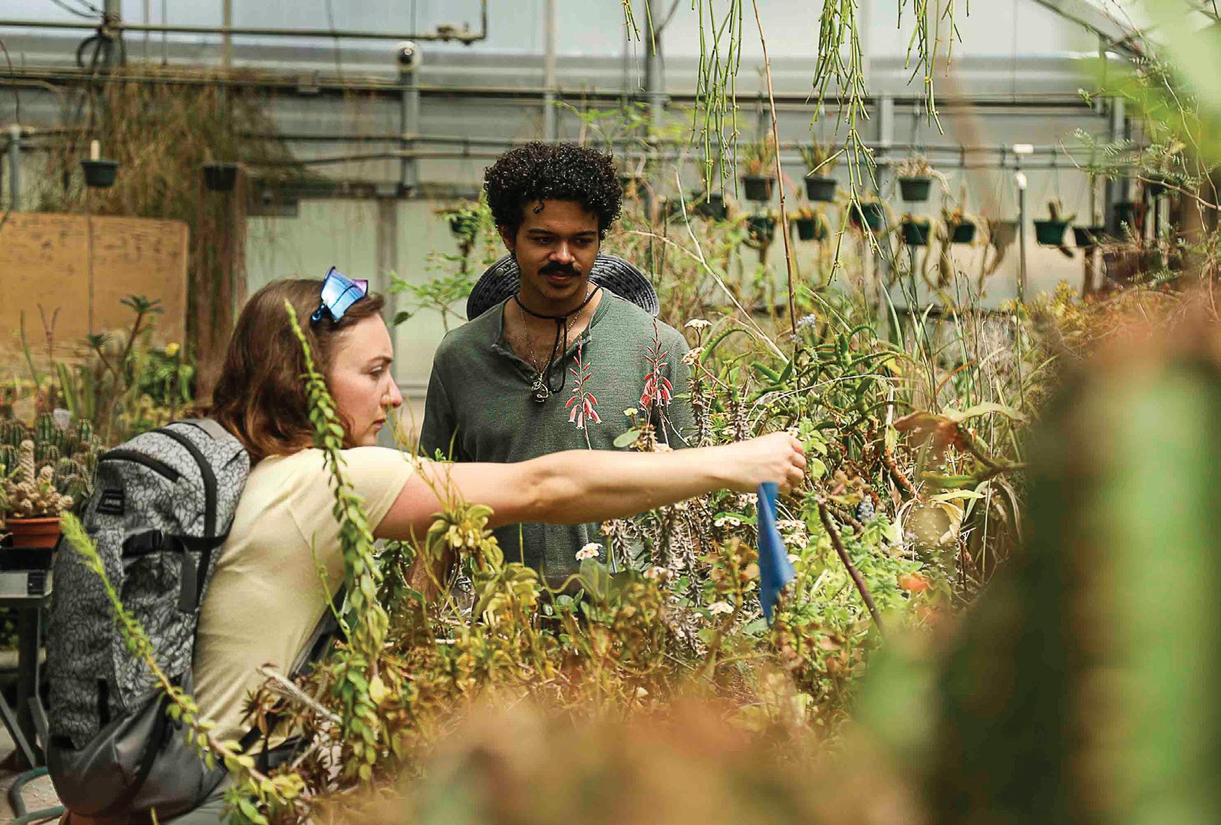 MIDDLE: (Left to Right) Horticulture students Lucille Whitesell and Maxim Reche look at plants in the desert plants greenhouse at The Huntington gardens in San Marino, Calif., on May 23, 2025. Photo by Gelareh Behdad