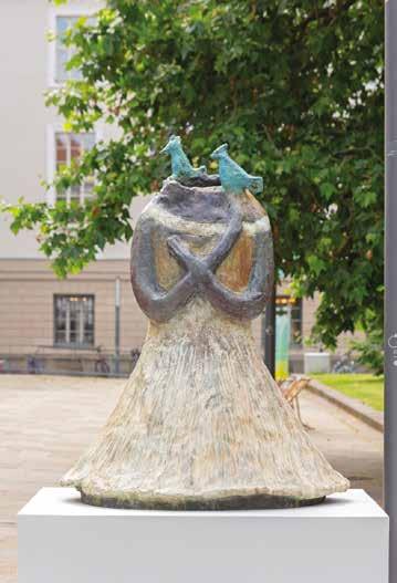 To side, Figure with Three Birds by Leiko Ikemura, 2021 Sculpture, patinated, from the exhibition With Blue Birds at the PalaisPopulaire, a permanent venue by Deutsche Bank Collection and an international forum for Art and culture in the heart of Berlin. Below, Light on the Horizon by Leiko Ikemura. Tempera on canvas from the exhibition at the Heredium Art Museum