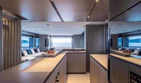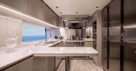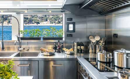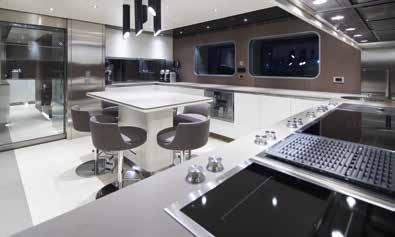 water-based eco-varnishes and latest-generation domestic appliances, like on the Infynito 90”, says Vanessa Mantuano of Ferretti Yachts’ Interior Design & Decor department. “Until a few years ago marble was a must in the kitchen, but nowadays owners are tending to choose ceramics or marble-effect materials, easier to maintain over the years they’re in use on the yacht. These days materials are both attractive and functional. Neutral colours dominate, though”. How does the chef make his or her ideas heard in the design phase? “In exactly the same way the skipper does when we’re creating a customised helm station”, says Enrico Lumini, Partner and Head of Design at HotLab, part of The Viken Group. “We see all kinds of requirements – they can vary from storage capacity, like having 1,000 refrigerated bottles on board at the same time, or to have any possible type of professional oven using any possible electric current. But most times the oddest requests concern storage space, especially refrigerated storage space: and we’re talking restaurant size”. As they do in homes, the models cover a full range of possibilities, in line or with islands, featuring Corian, slate, wood or stainless-steel work tops. Careful attention is paid to the layout of the work areas for cooking, preparation, plating up, clearing and cold storage, as well as the dry pantry. The result is stellar lunches and dinners.