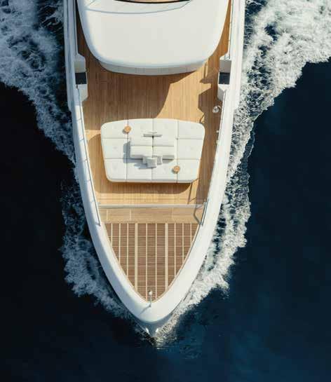 external lines respect the marine environment and embody a restrained luxury, while its interiors create a surprising illusory effect. “I tell a new story”, says Zuccon. “Here not everything is taken for granted, you can lose yourself in it, because in this division of spaces you no longer know what deck you’re on. The saloon is unique and is closely connected to four offset levels connected by a system of stairs. We have three sundecks on the 50 Steel at three different heights. Why do we call them Sundeck 1, 2, 3? We had to change the names of the decks because there’s no longer a hierarchy, they’re places that the owner chooses how to describe on the basis of the function he or she assigns to them”.