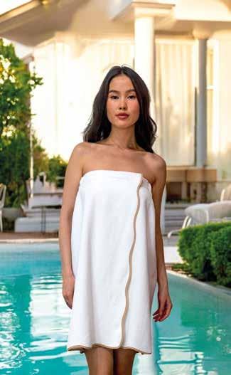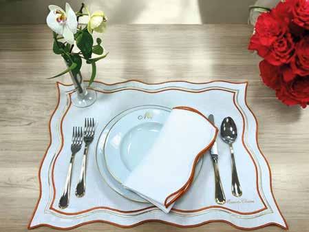 On this page, clockwise: Dedalo 4-corner placemat set; Clara Bertoli and Giulia Scalvini, the owners of Maison Claire; double-scallop orange placemat. Opposite page: doublelayer sauna towel; from the Blue Sky and Beverly Hills collection; from the Due Cordonetti collection; Maison Claire’s golden rose fragrances