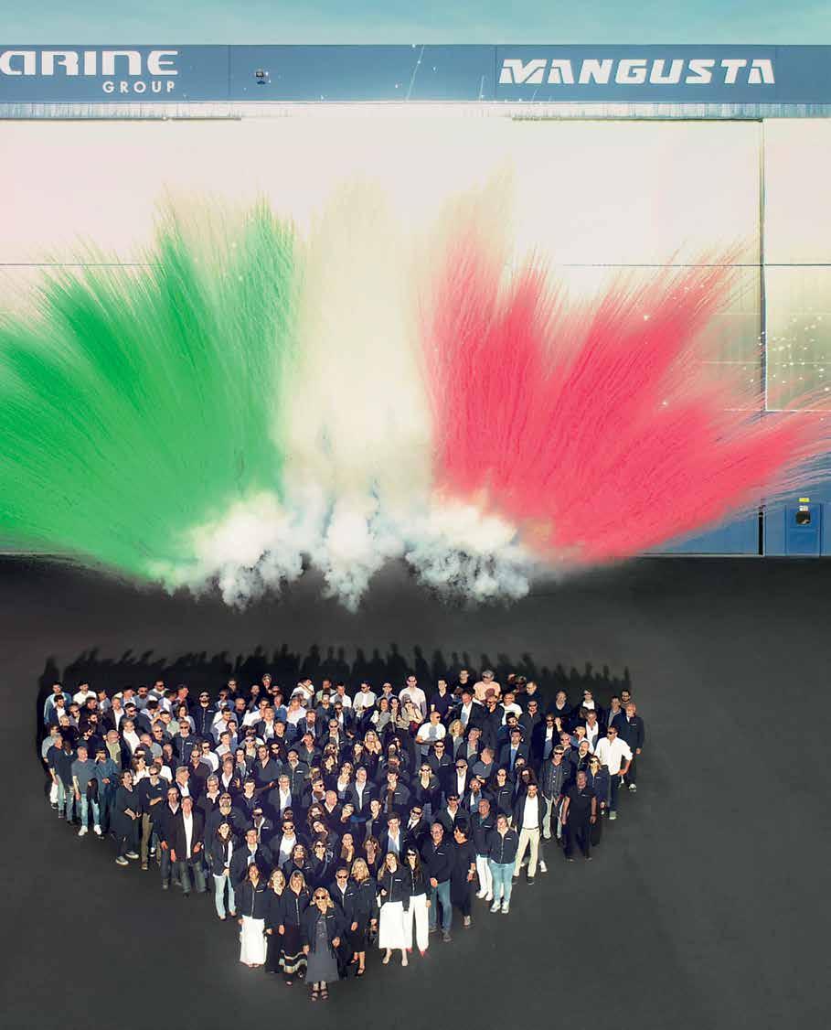 A group photo of the of the Overmarine team, a seasoned group of people who during forty years of activity have made possible the delivery of over 320 Mangusta yachts, authentic ambassadors of Italian luxury throughout the world