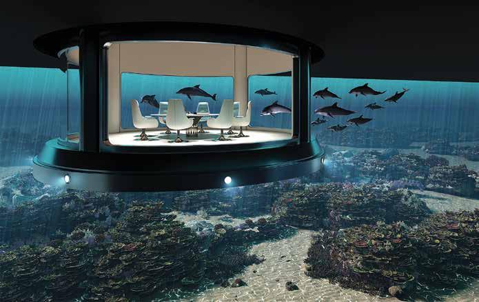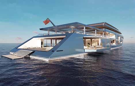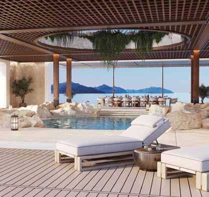 concept Poetry embodies this approach, featuring large, open decks, panoramic glass walls, and an interior layout that promotes natural light and fluid movement. “Poetry’s spatial structure is carefully planned to provide both private sanctuaries and social gathering areas, catering to a client who values both solitude and entertainment,” describes Sinot. Equally visionary is Inspire, a 138m concept that showcases Sinot’s capabilities in creating superyachts that offer functional, experiencedriven spaces. One of the standout features of the design is the blue hole swimming pool that offers direct views to the underwater world through its glass floor. Arguably the most significant feature, however, is the Nemo Room – a submersible underwater room in the keel of the yacht with glass walls.